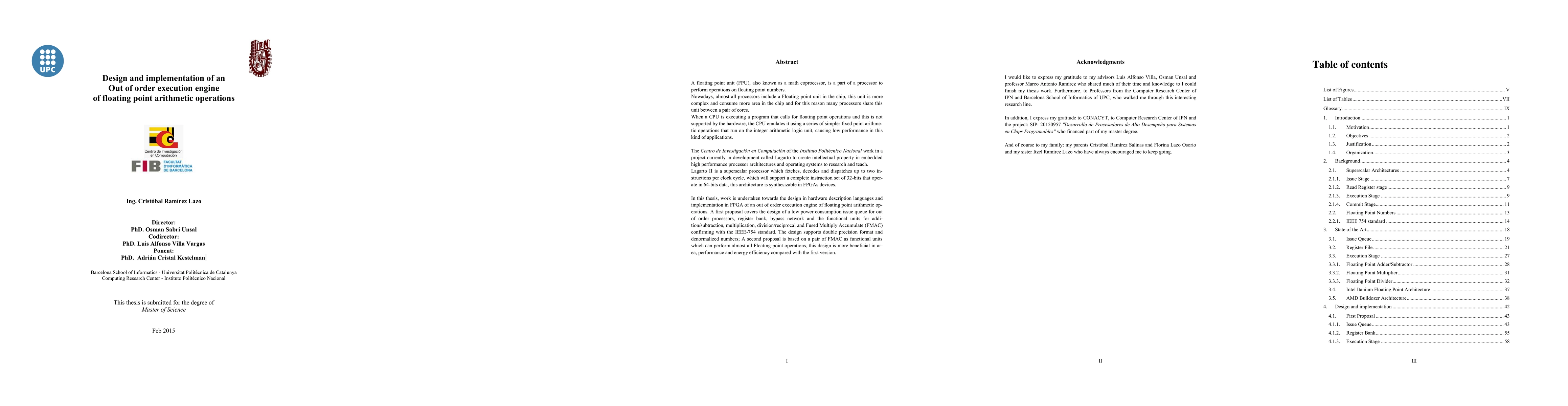 In this thesis, work is undertaken towards the design in hardware description languages and implementation in FPGA of an out-of-order execution engine of floating-point arithmetic operations for the Lagarto II core. A first proposal covers the design of a low power consumption issue queue for out-of-order processors, register bank, bypass network, and the functional units for addition/subtraction, multiplication, division/reciprocal, and Fused Multiply Accumulate (FMAC) confirming with the IEEE-754 standard. The design supports double-precision format and denormalized numbers; A second proposal is based on a pair of FMAC as functional units which can perform almost all Floating-point operations, this design is more beneficial in area, performance, and energy efficiency compared with the first version.