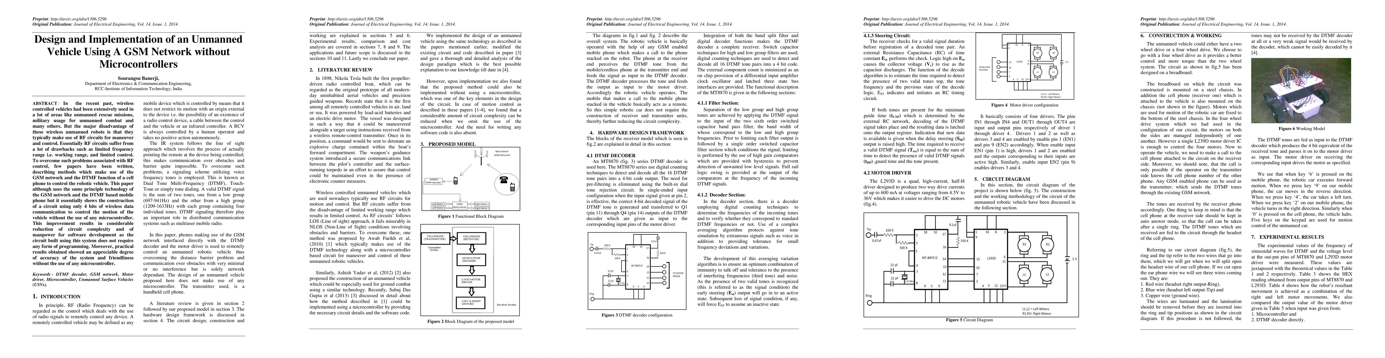This paper presents a design for an unmanned vehicle controlled via GSM network using DTMF signals without microcontrollers, utilizing only 4 bits of wireless data for motion control, which simplifies circuit complexity and eliminates the need for software programming. Practical results demonstrate the system's accuracy and ease of use.