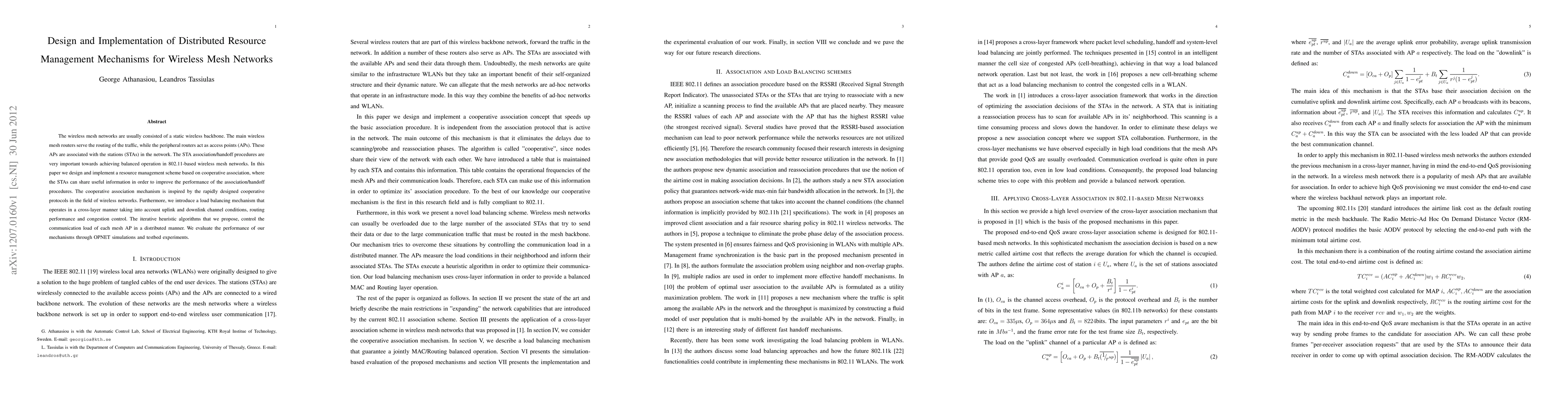 This paper designs and implements a distributed resource management scheme for wireless mesh networks, utilizing cooperative association to enhance association/handoff procedures and introducing a cross-layer load balancing mechanism. Performance is evaluated via OPNET simulations and testbed experiments.