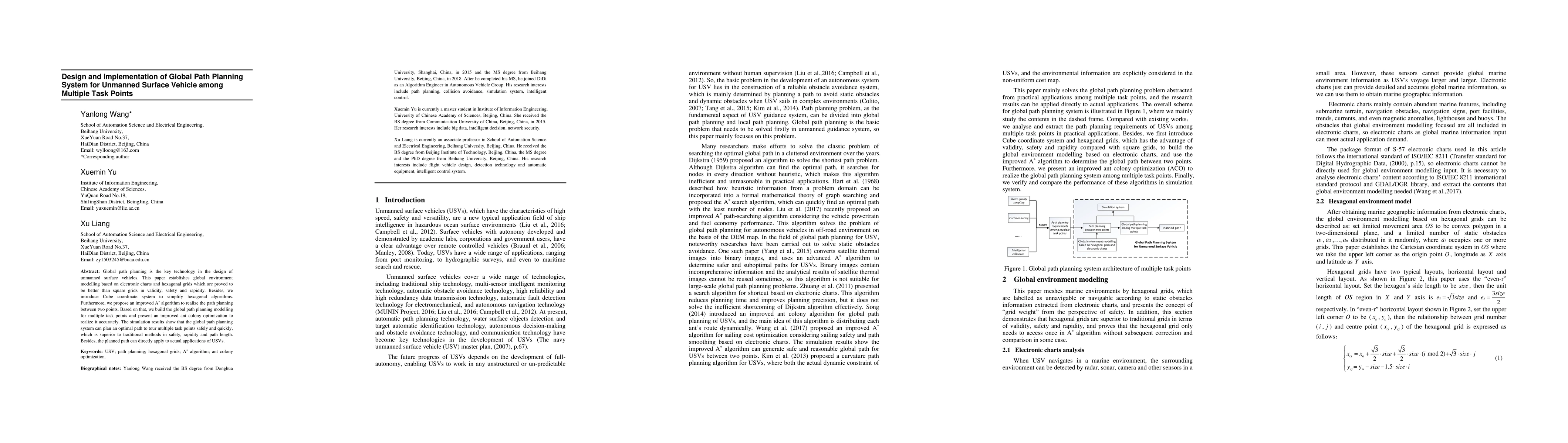 This paper develops a global path planning system for unmanned surface vehicles using hexagonal grids and an improved A* algorithm for efficient pathfinding. It also introduces an advanced ant colony optimization method for planning paths among multiple task points, demonstrating superior safety, speed, and path efficiency compared to traditional methods.