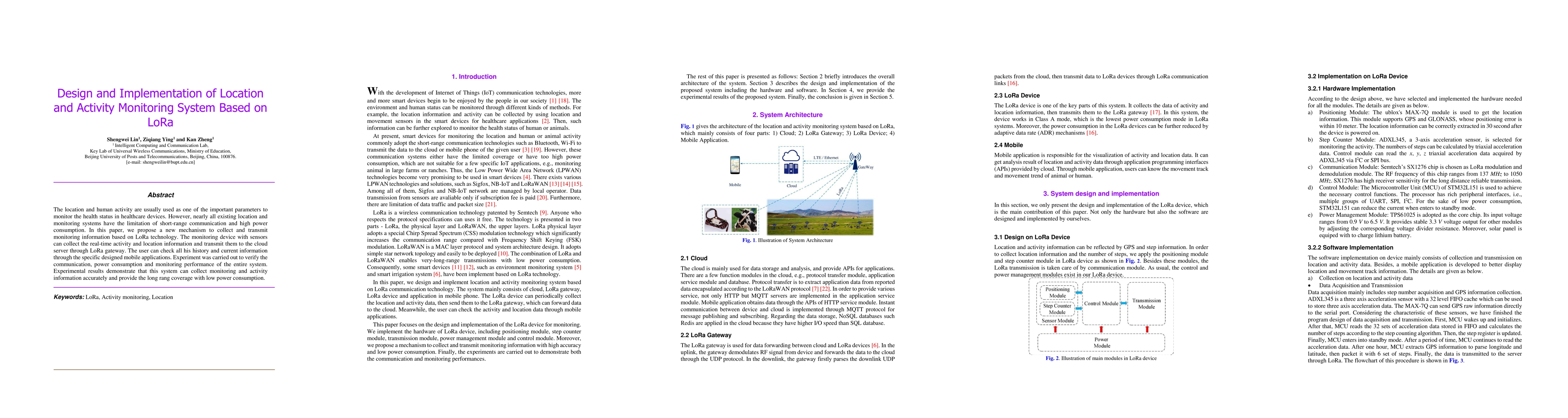 This paper proposes a LoRa-based system for monitoring human activity and location, addressing the limitations of existing systems in range and power consumption. The system uses sensors to collect data and transmit it via LoRa to a cloud server, enabling users to access their information through mobile apps, with experiments showing accurate data collection and long-range coverage with low power usage.