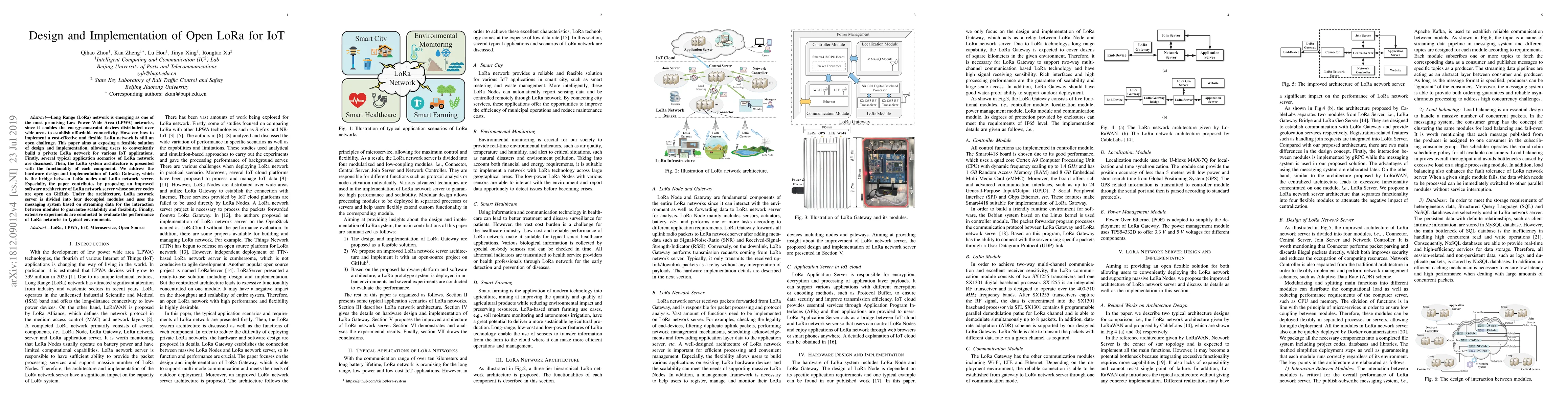 The research presents a design and implementation of an open LoRa network for IoT, discussing typical application scenarios, system architecture, hardware design of LoRa Gateway, and an improved software architecture of LoRa network server with open-source codes on GitHub.