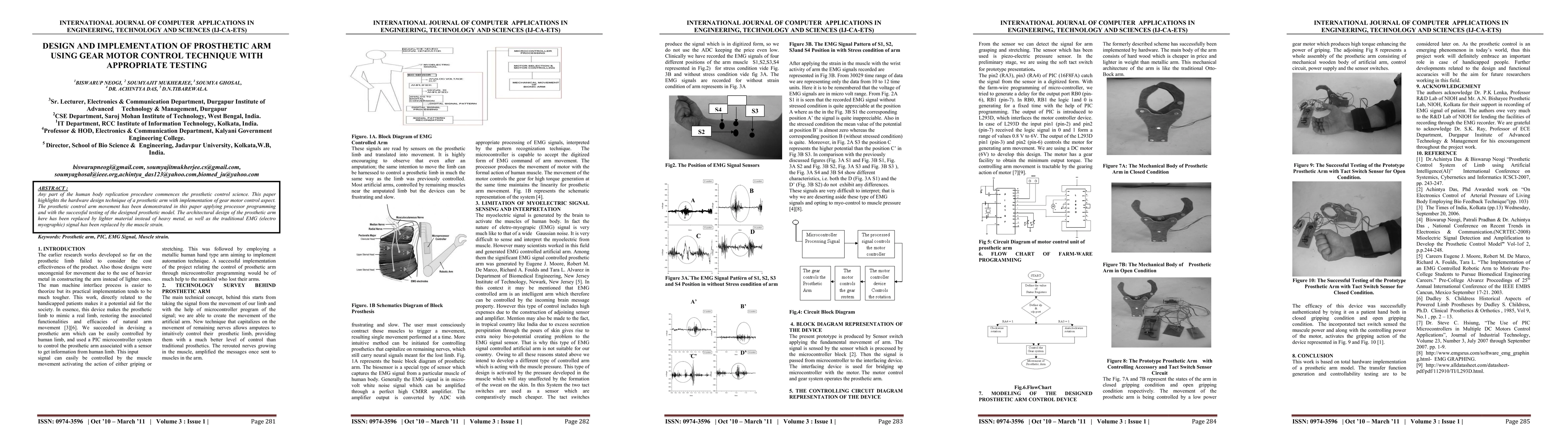 Any part of the human body replication procedure commences the prosthetic control science. This paper highlights the hardware design technique of a prosthetic arm with implementation of gear motor control aspect. The prosthetic control arm movement has been demonstrated in this paper applying processor programming and with the successful testing of the designed prosthetic model. The architectural design of the prosthetic arm here has been replaced by lighter material instead of heavy metal, as well as the traditional EMG (electro myographic) signal has been replaced by the muscle strain.