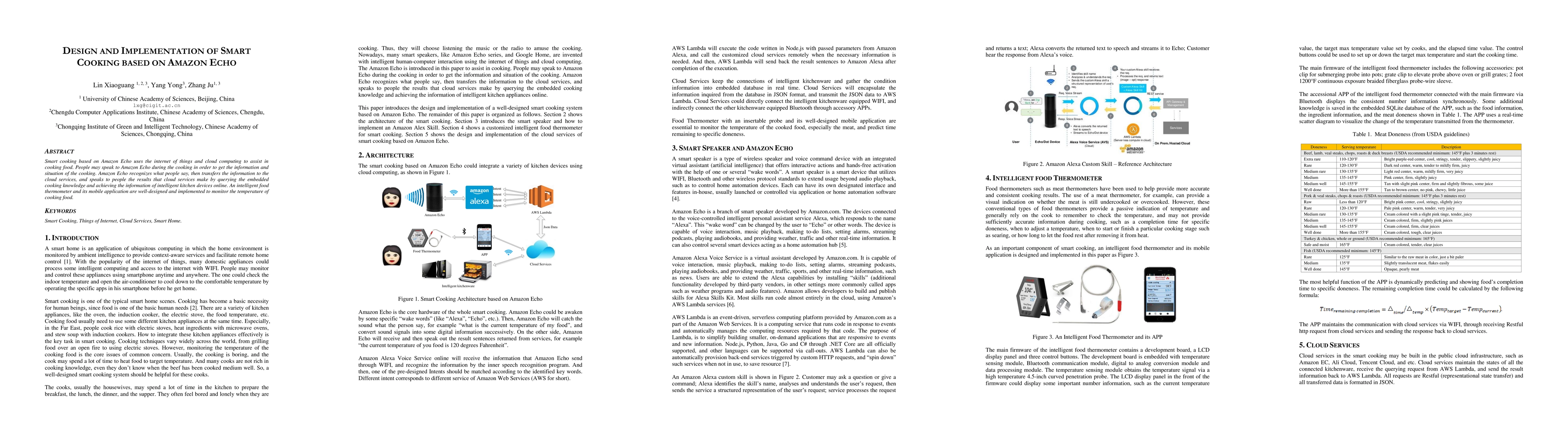 A smart cooking system using Amazon Echo utilizes IoT and cloud computing to provide cooking assistance through voice commands. It integrates with a food thermometer and mobile app for precise temperature monitoring and online kitchen device connectivity.