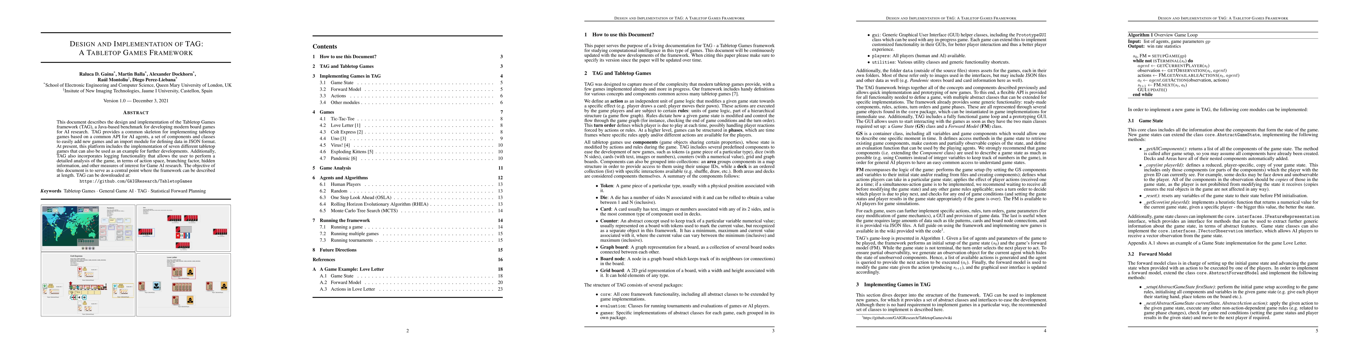This document describes the design and implementation of the Tabletop Games framework (TAG), a Java-based benchmark for developing modern board games for AI research. TAG provides a common skeleton for implementing tabletop games based on a common API for AI agents, a set of components and classes to easily add new games and an import module for defining data in JSON format. At present, this platform includes the implementation of seven different tabletop games that can also be used as an example for further developments. Additionally, TAG also incorporates logging functionality that allows the user to perform a detailed analysis of the game, in terms of action space, branching factor, hidden information, and other measures of interest for Game AI research. The objective of this document is to serve as a central point where the framework can be described at length. TAG can be downloaded at: https://github.com/GAIGResearch/TabletopGames
