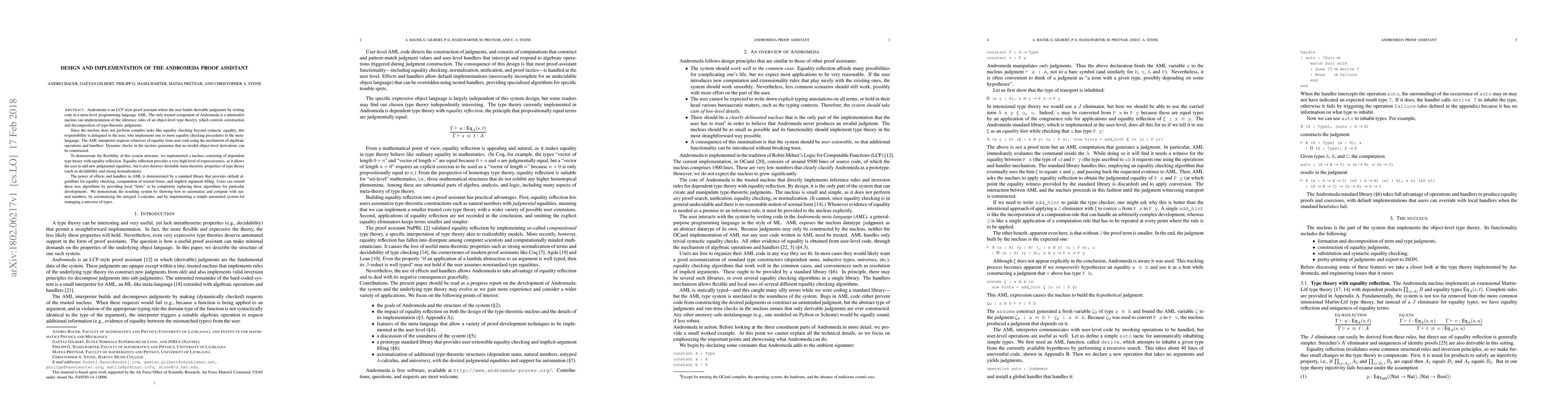 The Andromeda proof assistant, described in this paper, uses an LCF-style approach where users write meta-level code in AML to construct provable judgments. Its trusted nucleus implements object-level inference rules, with equality checking delegated to untrusted user code. The system's flexibility is shown through a dependent type theory nucleus with equality reflection, despite its potential to compromise decidability and strong normalization. AML's power is further illustrated via a standard library for equality checking, normal form computation, and implicit argument filling, which users can customize. The paper demonstrates Andromeda's capabilities through examples like natural number axiomatization, untyped $lambda$-calculus axiomatization, and a simple type universe management system.