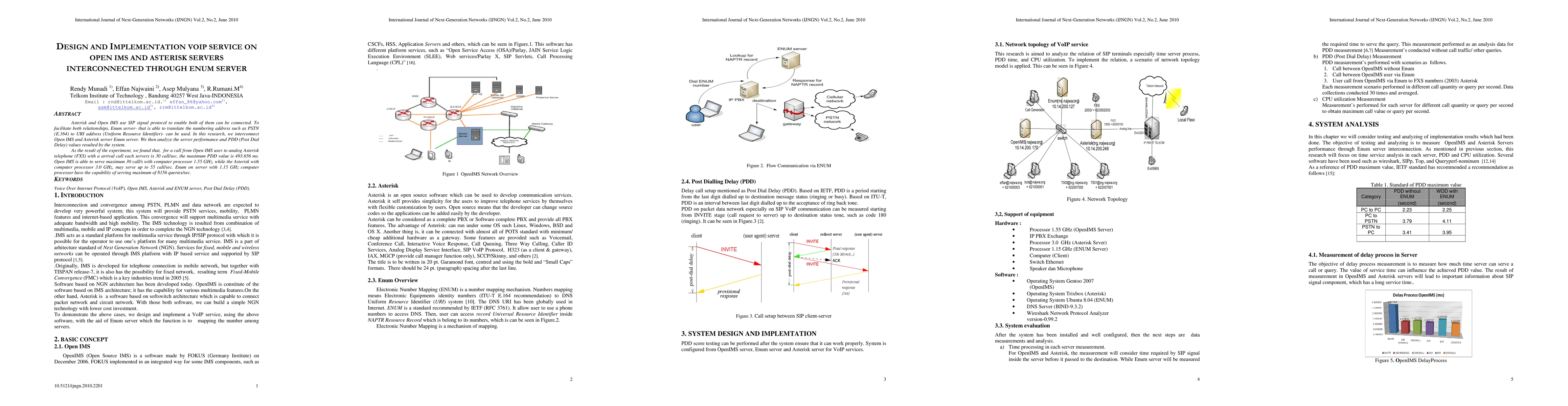 This research designs and implements a VOIP service by interconnecting Open IMS and Asterisk servers using an Enum server for address translation. The study analyzes performance metrics and finds that Open IMS can handle up to 30 calls per second, while Asterisk can manage up to 55 calls per second, with respective server processing capabilities.