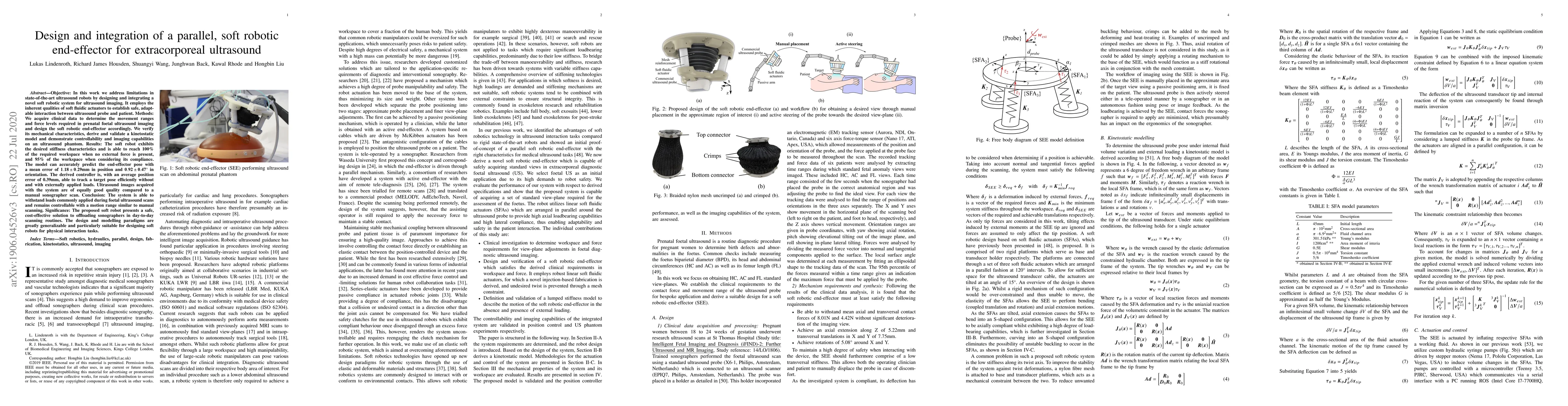 This research designs and integrates a parallel soft robotic end-effector for extracorporeal ultrasound imaging, achieving safe and adaptable interaction with a mean position error of 0.39mm. The system demonstrates high controllability and comparable imaging quality to manual sonographer scans, offering a cost-effective solution to assist in routine ultrasound procedures.