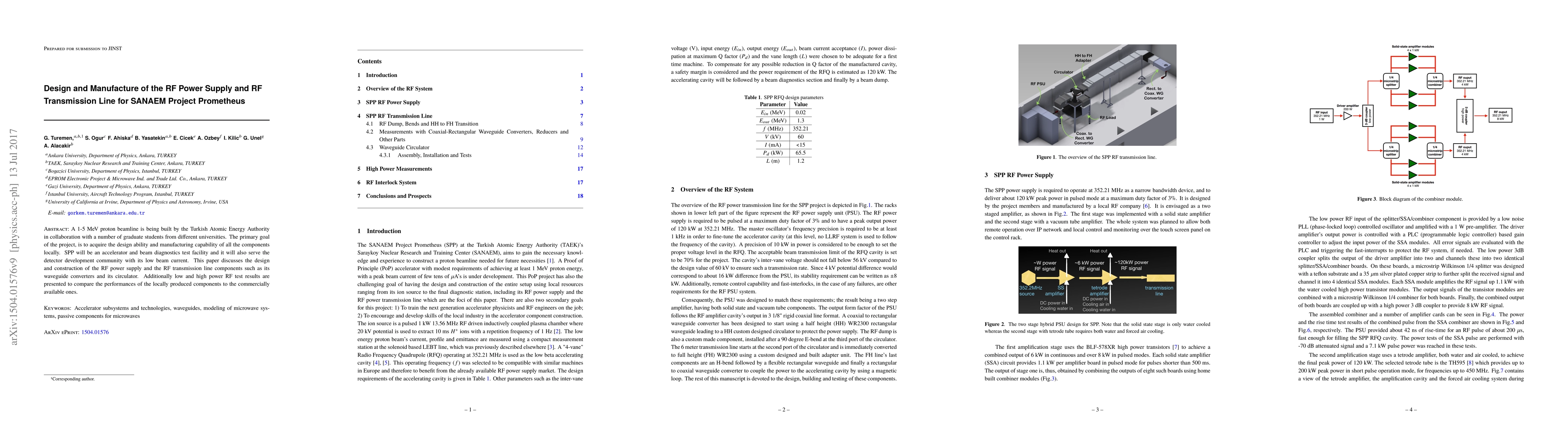 A 1-5 MeV proton beamline is being built by the Turkish Atomic Energy Authority in collaboration with a number of graduate students from different universities. The primary goal of the project, is to acquire the design ability and manufacturing capability of all the components locally. SPP will be an accelerator and beam diagnostics test facility and it will also serve the detector development community with its low beam current. This paper discusses the design and construction of the RF power supply and the RF transmission line components such as its waveguide converters and its circulator. Additionally low and high power RF test results are presented to compare the performances of the locally produced components to the commercially available ones.
