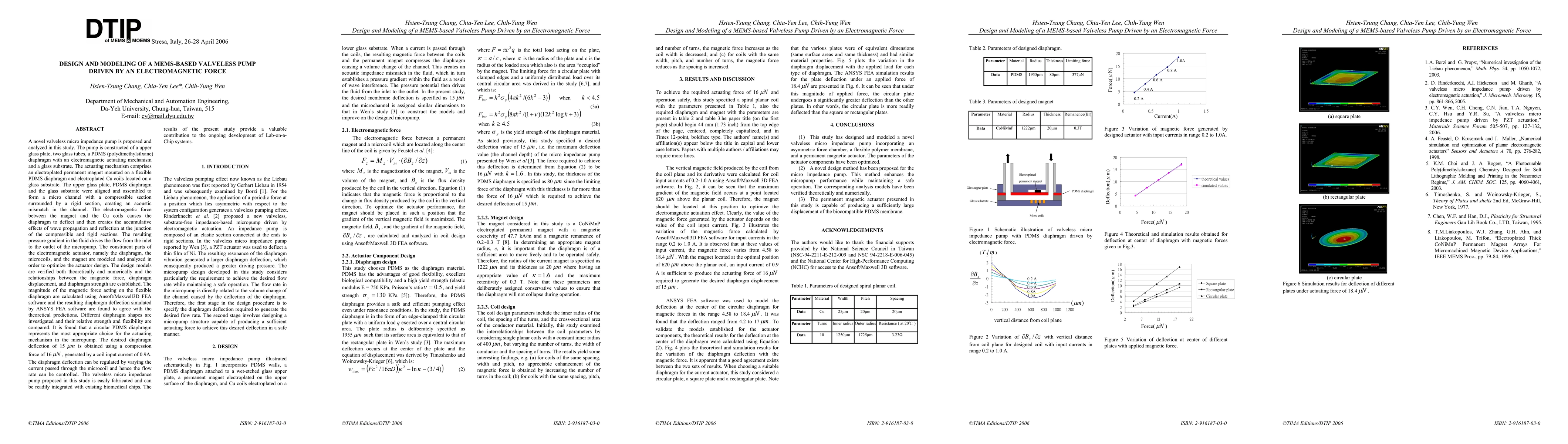 Summary: This paper introduces a new valveless micro impedance pump utilizing MEMS technology and driven by electromagnetic forces, with a detailed analysis of its design and operational principles. The study aims to enhance fluid transport efficiency without traditional valves.