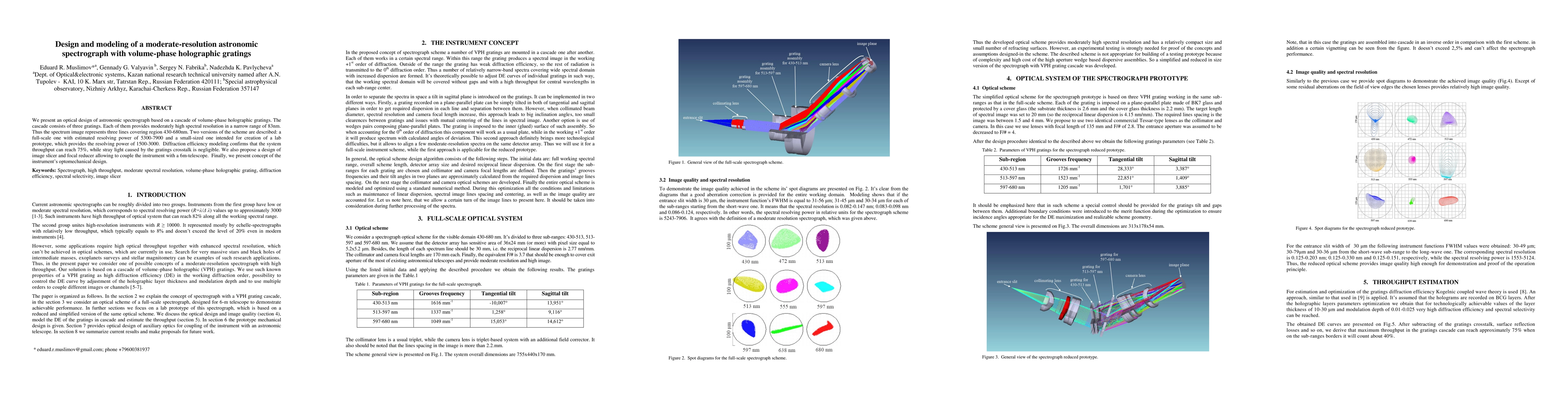 This paper details the design of an astronomic spectrograph utilizing volume-phase holographic gratings, achieving moderate spectral resolution over a 250 nm range. The design includes two versions, with resolving powers of 5300-7900 and 1500-3000, and a modeling showing 75% system throughput with minimal stray light.