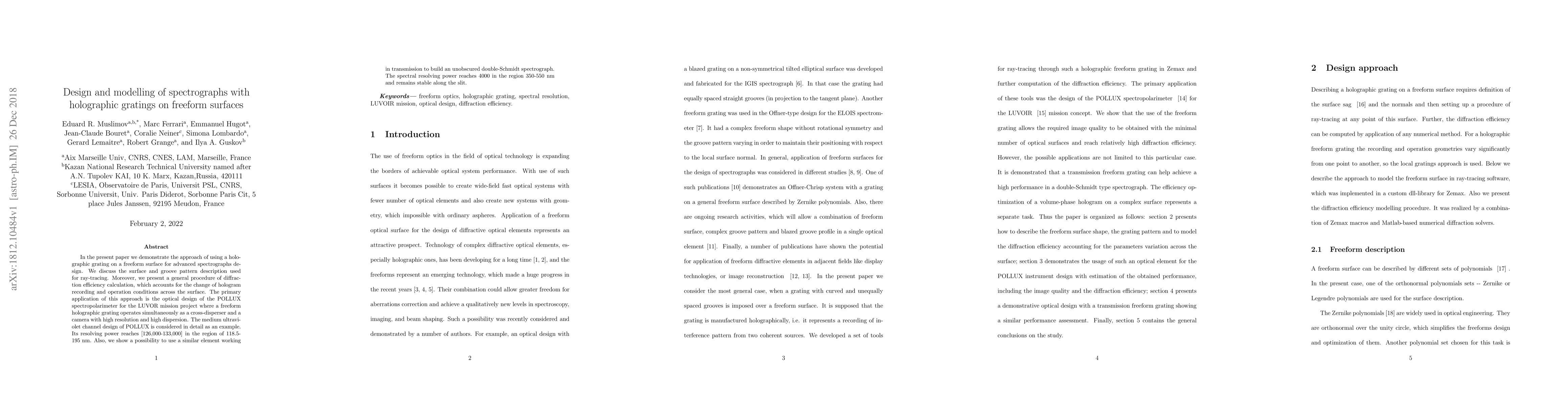 This paper explores the design of advanced spectrographs using holographic gratings on freeform surfaces, detailing the ray-tracing and diffraction efficiency calculations. The POLLUX spectropolarimeter for the LUVOR mission exemplifies this approach, achieving high resolution and dispersion in the medium ultraviolet range.