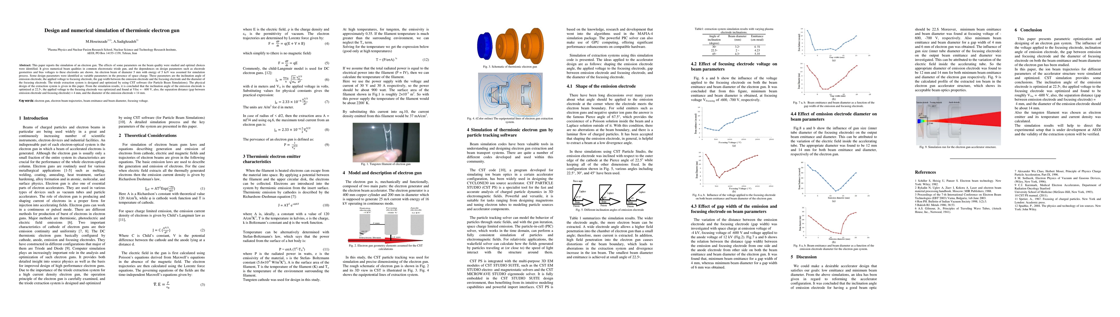 This paper reports the simulation of an electron gun. The effects of some parameters on the beam quality were studied and optimal choices were identified. It gives numerical beam qualities in common electrostatic triode gun, and the dependences on design parameters such as electrode geometries and bias voltages to these electrodes are shown. An electron beam of diameter 5 mm with energy of five kilo electron volt was assumed for simulation process. Some design parameters were identified as variable parameters in the presence of space charge. These parameters are the inclination angle of emission electrode, the applied voltage to focusing electrode, the gap width between the emission electrode and the focusing electrode and the diameter of the focusing electrode. The triode extraction system is designed and optimized by using CST software (for Particle Beam Simulations). The physical design of the extraction system is given in this paper. From the simulation results, it is concluded that the inclination angle of the emission electrode is optimized at twenty two point five degrees, the applied voltage to the focusing electrode was optimized and found at minus sixteen volts, also, the separation distance (gap between emission electrode and focusing electrode) equals to four milli meter, and the diameter of the emission electrode is fourteen milli meter.