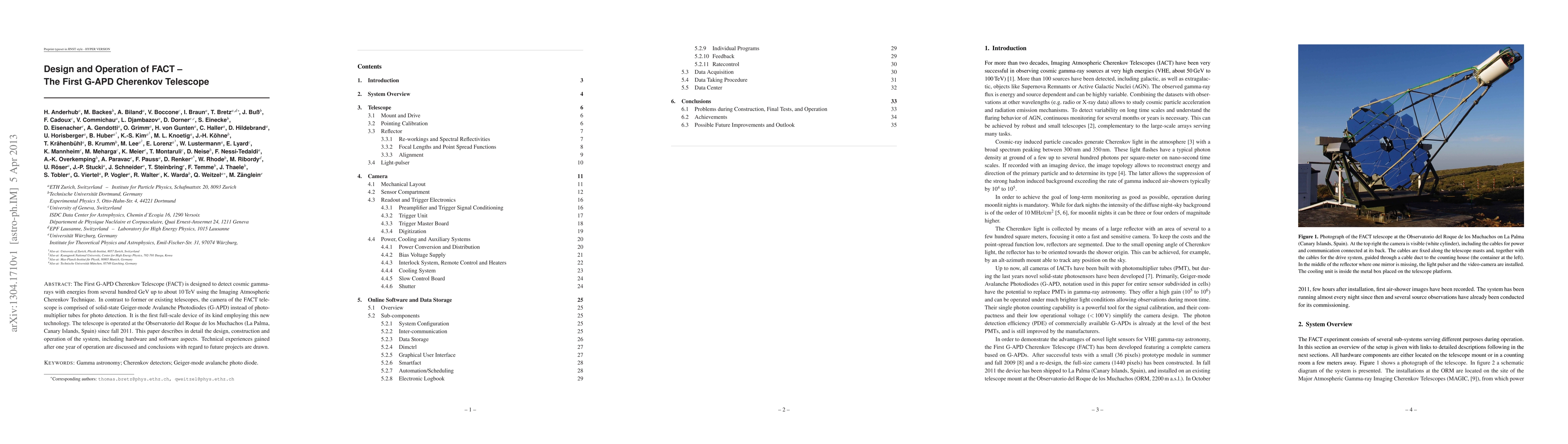 The FACT telescope, the first G-APD Cherenkov telescope, employs solid-state Geiger-mode Avalanche Photodiodes for detecting cosmic gamma-rays in the range of several hundred GeV to 10 TeV. Operational since 2011 at La Palma, it details its design, construction, and initial operational experiences.