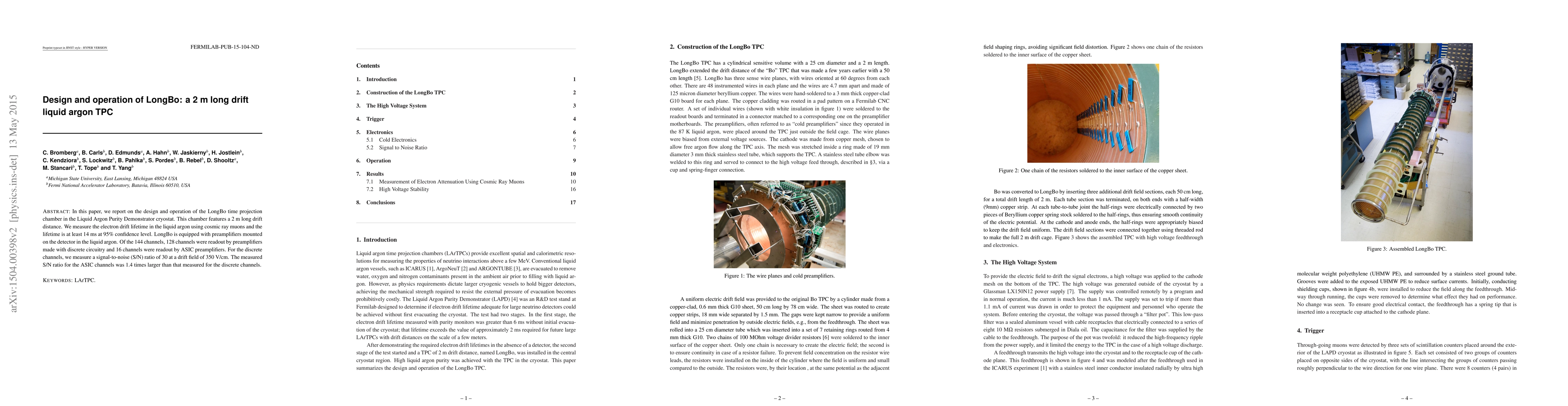 In this paper, we report on the design and operation of the LongBo time projection chamber in the Liquid Argon Purity Demonstrator cryostat. This chamber features a 2 m long drift distance. We measure the electron drift lifetime in the liquid argon using cosmic ray muons and the lifetime is at least 14 ms at 95\% confidence level. LongBo is equipped with preamplifiers mounted on the detector in the liquid argon. Of the 144 channels, 128 channels were readout by preamplifiers made with discrete circuitry and 16 channels were readout by ASIC preamplifiers. For the discrete channels, we measure a signal-to-noise (S/N) ratio of 30 at a drift field of 350 V/cm. The measured S/N ratio for the ASIC channels was 1.4 times larger than that measured for the discrete channels.