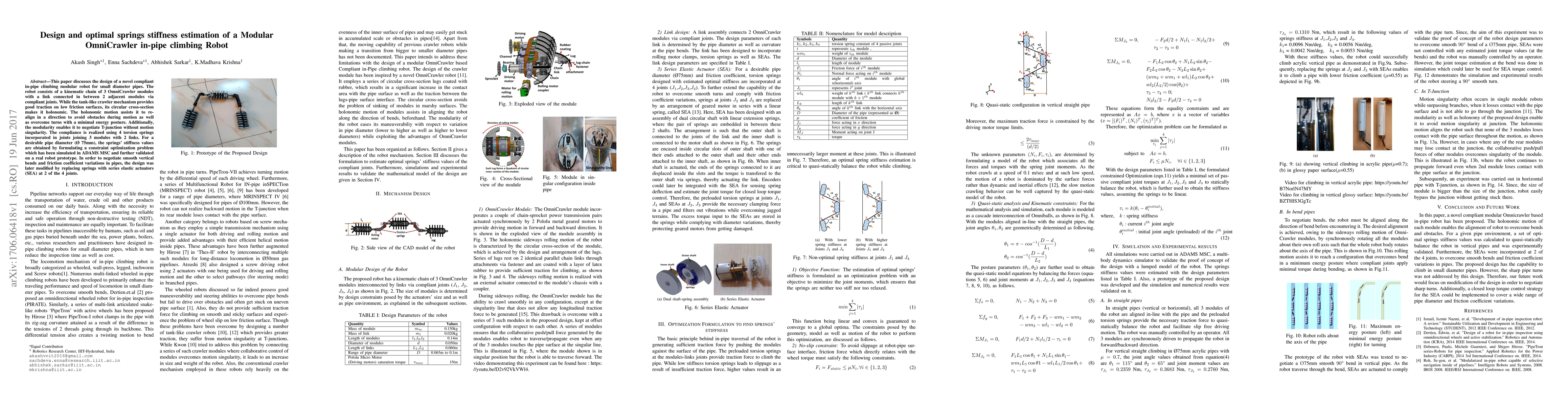 This paper presents the design and optimal stiffness estimation for a modular in-pipe climbing robot using OmniCrawler modules connected by compliant joints with torsion springs. The robot's holonomic and modular design allows it to navigate obstacles and T-junctions efficiently, with modifications including series elastic actuators for smoother vertical bends.