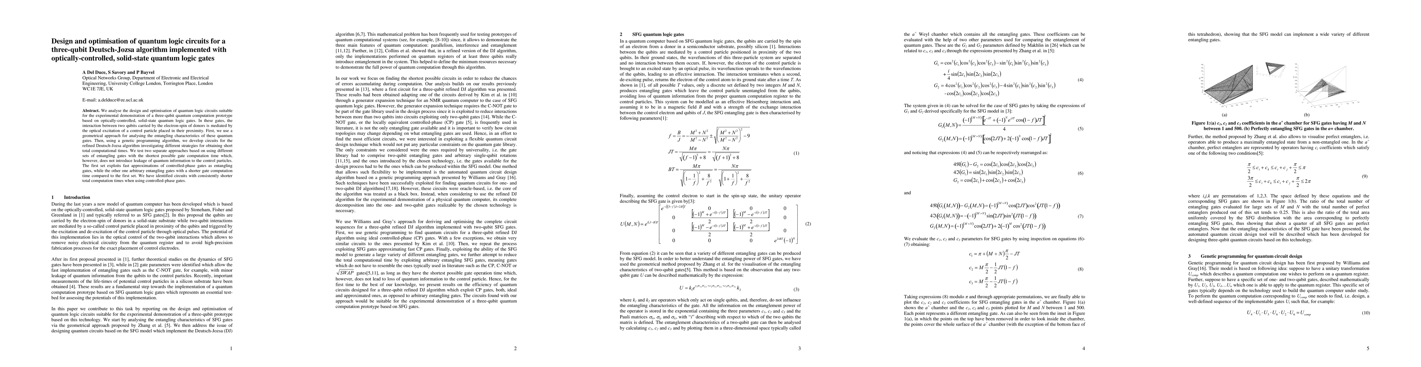 We analyse the design and optimisation of quantum logic circuits suitable for the experimental demonstration of a three-qubit quantum computation prototype based on optically-controlled, solid-state quantum logic gates. In these gates, the interaction between two qubits carried by the electron-spin of donors is mediated by the optical excitation of a control particle placed in their proximity. First, we use a geometrical approach for analysing the entangling characteristics of these quantum gates. Then, using a genetic programming algorithm, we develop circuits for the refined Deutsch-Jozsa algorithm investigating different strategies for obtaining short total computational times. We test two separate approaches based on using different sets of entangling gates with the shortest possible gate computation time which, however, does not introduce leakage of quantum information to the control particles. The first set exploits fast approximations of controlled-phase gates as entangling gates, while the other one arbitrary entangling gates with a shorter gate computation time compared to the first set. We have identified circuits with consistently shorter total computation times when using controlled-phase gates.