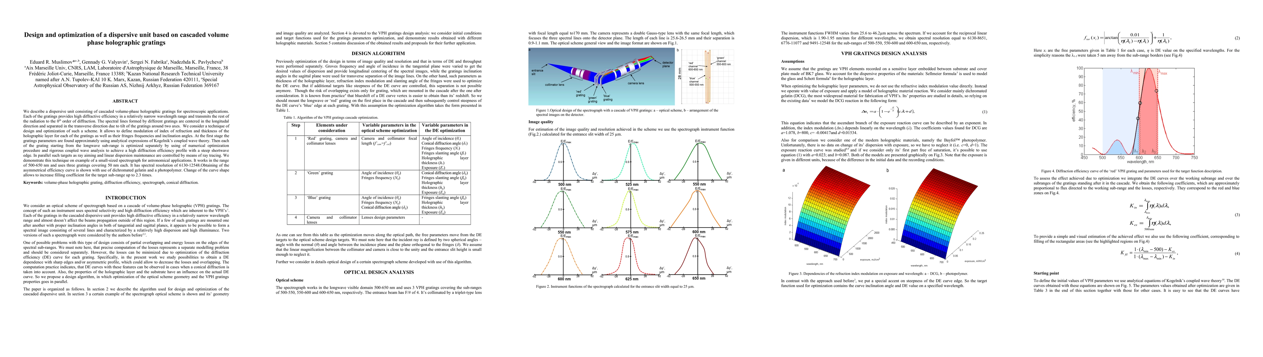 This paper details the design and optimization of a dispersive unit using cascaded volume-phase holographic gratings for spectroscopic applications, achieving high diffraction efficiency and optimizing parameters via analytical and numerical methods. The optimized spectrograph covers 500-650 nm with three gratings, enhancing spectral resolution and filling coefficient.