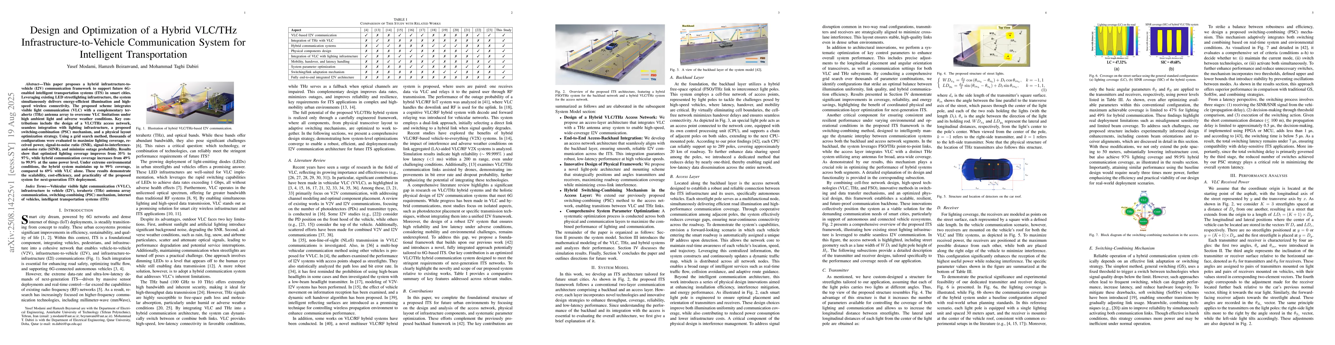 This paper proposes a hybrid infrastructure-to-vehicle (I2V) communication framework to support future 6G-enabled intelligent transportation systems (ITS) in smart cities. Leveraging existing LED streetlighting infrastructure, the system simultaneously delivers energy-efficient illumination and high-speed wireless connectivity. The proposed scheme integrates visible light communication (VLC) with a complementary ter-ahertz (THz) antenna array to overcome VLC limitations under high ambient light and adverse weather conditions. Key con-tributions include the design of a VLC/THz access network, seamless integration with lighting infrastructure, a proposed switching-combination (PSC) mechanism, and a physical layout optimization strategy. Using a grid search method, thousands of configurations were evaluated to maximize lighting coverage, re-ceived power, signal-to-noise ratio (SNR), signal-to-interference-and-noise ratio (SINR), and minimize outage probability. Results show that optimized lighting coverage improves from 35% to 97%, while hybrid communication coverage increases from 49%to 99.9% at the same power level. Under extreme environmental conditions, the hybrid system maintains up to 99% coverage, compared to 69% with VLC alone. These results demonstrate the scalability, cost-efficiency, and practicality of the proposed system for next-generation ITS deployment.