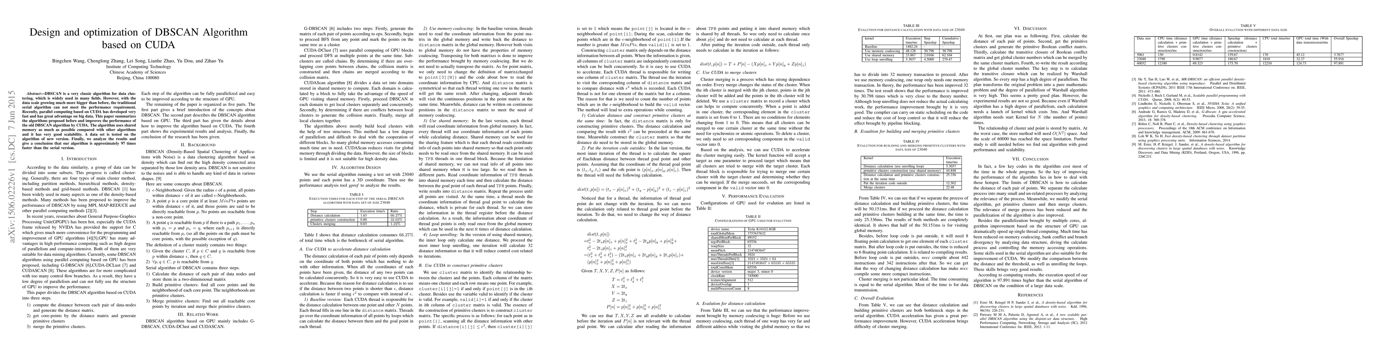This paper optimizes the DBSCAN clustering algorithm using CUDA for parallel computing, significantly improving performance for large datasets. The optimized version leverages shared memory and demonstrates excellent scalability, achieving nearly 97 times faster results compared to the traditional serial version.
