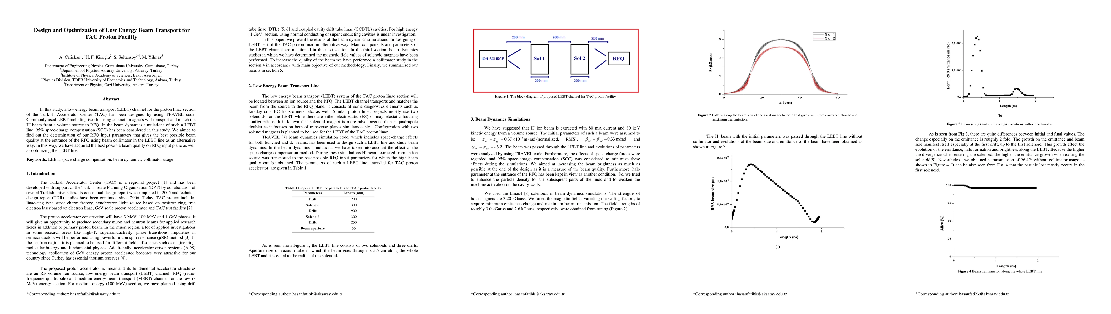 In this study, a low energy beam transport (LEBT) channel for the proton linac section of the Turkish Accelerator Center (TAC) has been designed by using TRAVEL code. Commonly used LEBT including two focusing solenoid magnets will transport and match the H- beam from a volume source to RFQ. In the beam dynamics simulations of such a LEBT line, 95% space-charge compensation (SCC) has been considered in this study. We aimed to find out the determination of our RFQ input parameters that gives the best possible beam quality at the entrance of the RFQ using beam collimator in the LEBT line as an alternative way. In this way, we have acquired the best possible beam quality on RFQ input plane as well as optimizing the LEBT line.