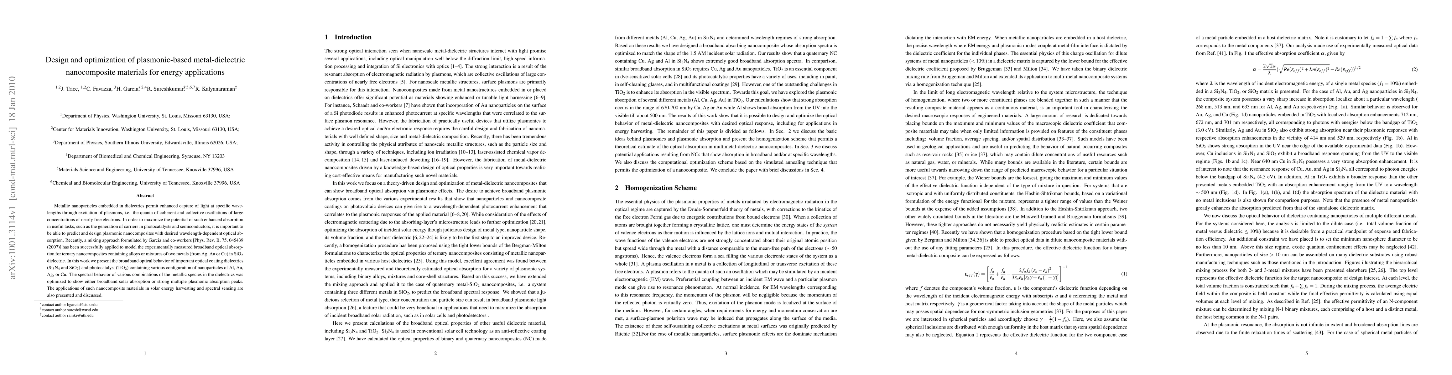 Metallic nanoparticles embedded in dielectrics permit enhanced capture of light at specific wavelengths through excitation of plasmons, i.e. the quanta of coherent and collective oscillations of large concentrations of nearly free electrons. In order to maximize the potential of such enhanced absorption in useful tasks, such as the generation of carriers in photocatalysts and semiconductors, it is important to be able to predict and design plasmonic nanocomposites with desired wavelength-dependent optical absorption. Recently, a mixing approach formulated by Garcia and co-workers [Phys. Rev. B, 75, 045439 (2007)] has been successfully applied to model the experimentally measured broadband optical absorption for ternary nanocomposites containing alloys or mixtures of two metals (from Ag, Au or Cu) in SiO dielectric. In this work we present the broadband optical behavior of important optical coating dielectrics (SiN and SiO) and photocatalyst (TiO) containing various configuration of nanoparticles of Al, Au, Ag, or Cu. The spectral behavior of various combinations of the metallic species in the dielectrics was optimized to show either broadband solar absorption or strong multiple plasmonic absorption peaks. The applications of such nanocomposite materials in solar energy harvesting and spectral sensing are also presented and discussed.