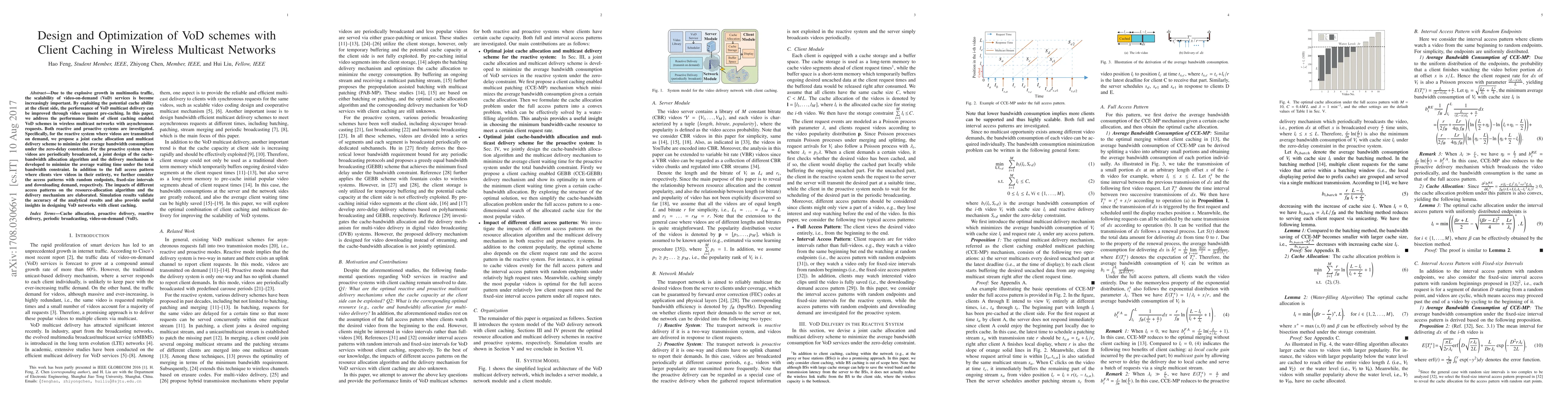 This paper proposes optimization strategies for VoD schemes in wireless multicast networks, focusing on client caching to improve performance. It develops joint cache allocation and delivery mechanisms for both reactive and proactive systems to minimize bandwidth consumption and waiting time, respectively, under various access patterns.