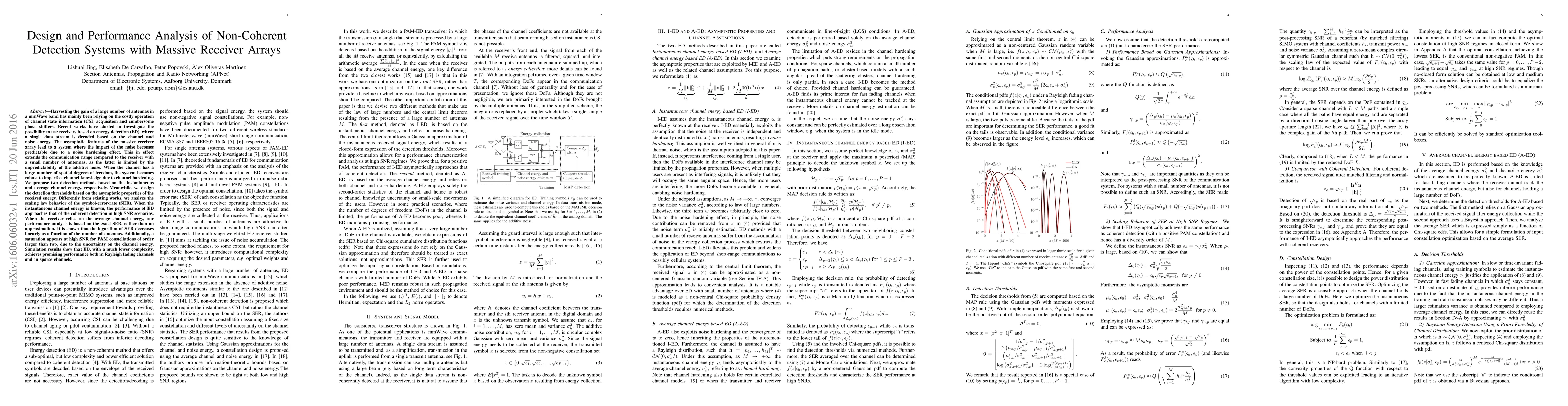 Harvesting the gain of a large number of antennas in a mmWave band has mainly been relying on the costly operation of channel state information (CSI) acquisition and cumbersome phase shifters. Recent works have started to investigate the possibility to use receivers based on energy detection (ED), where a single data stream is decoded based on the channel and noise energy. The asymptotic features of the massive receiver array lead to a system where the impact of the noise becomes predictable due to a noise hardening effect. This in effect extends the communication range compared to the receiver with a small number of antennas, as the latter is limited by the unpredictability of the additive noise. When the channel has a large number of spatial degrees of freedom, the system becomes robust to imperfect channel knowledge due to channel hardening. We propose two detection methods based on the instantaneous and average channel energy, respectively. Meanwhile, we design the detection thresholds based on the asymptotic properties of the received energy. Differently from existing works, we analyze the scaling law behavior of the symbol-error-rate (SER). When the instantaneous channel energy is known, the performance of ED approaches that of the coherent detection in high SNR scenarios. When the receiver relies on the average channel energy, our performance analysis is based on the exact SER, rather than an approximation. It is shown that the logarithm of SER decreases linearly as a function of the number of antennas. Additionally, a saturation appears at high SNR for PAM constellations of order larger than two, due to the uncertainty on the channel energy. Simulation results show that ED, with a much lower complexity, achieves promising performance both in Rayleigh fading channels and in sparse channels.