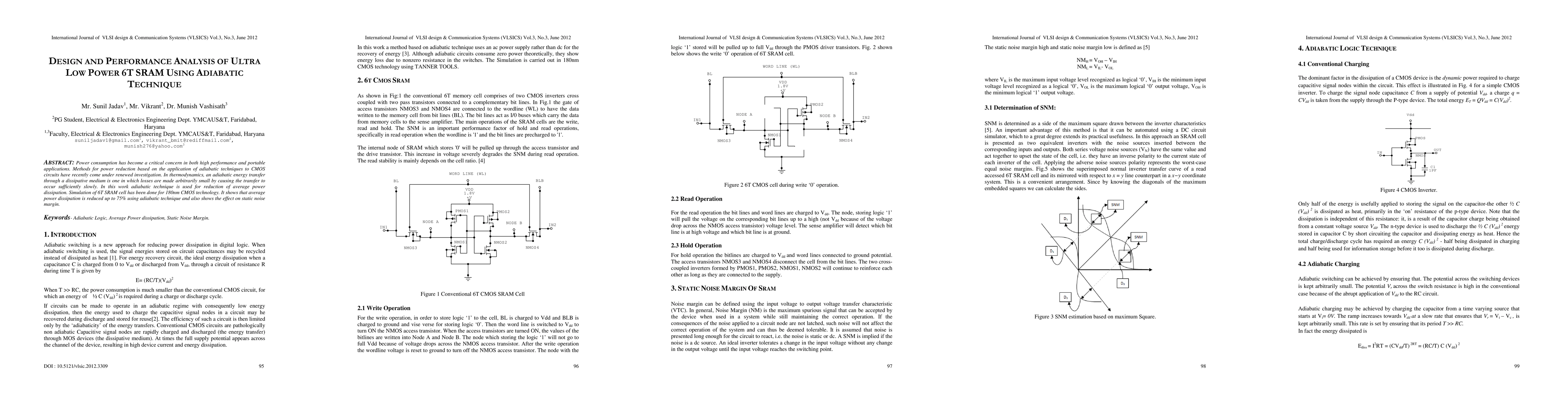 This paper investigates the application of adiabatic techniques to a 6T SRAM cell for ultra-low power consumption, achieving up to 75% reduction in average power dissipation. The study also examines the impact on static noise margin in 180nm CMOS technology.