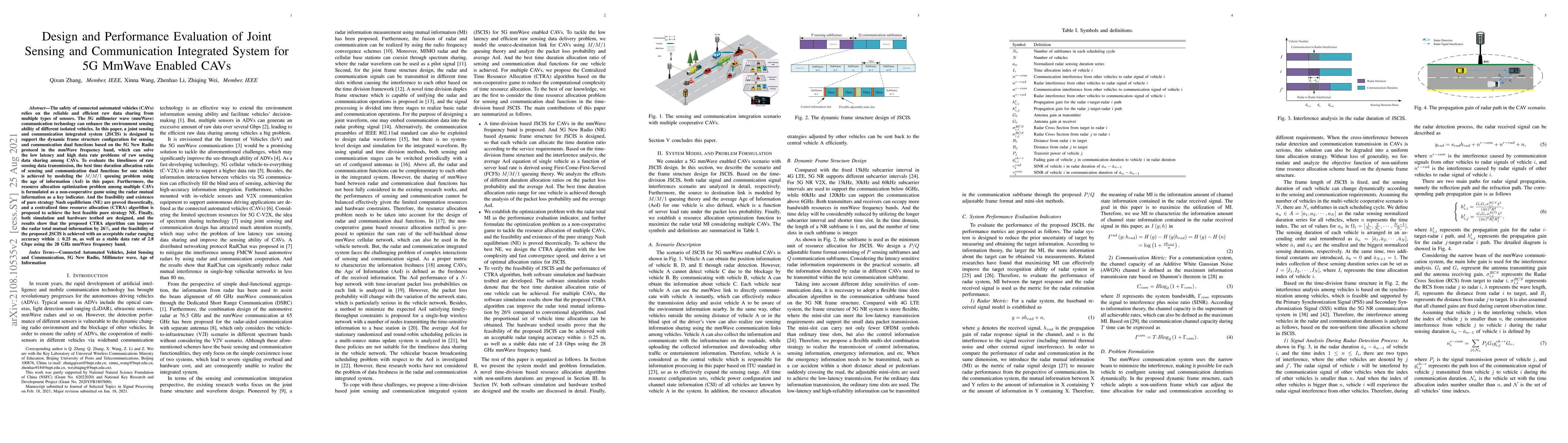 This paper designs a joint sensing and communication integrated system (JSCIS) for 5G mmWave enabled CAVs, optimizing resource allocation through a non-cooperative game to enhance data sharing efficiency. Simulation and hardware tests demonstrate a 26% improvement in radar mutual information and an acceptable ranging accuracy.