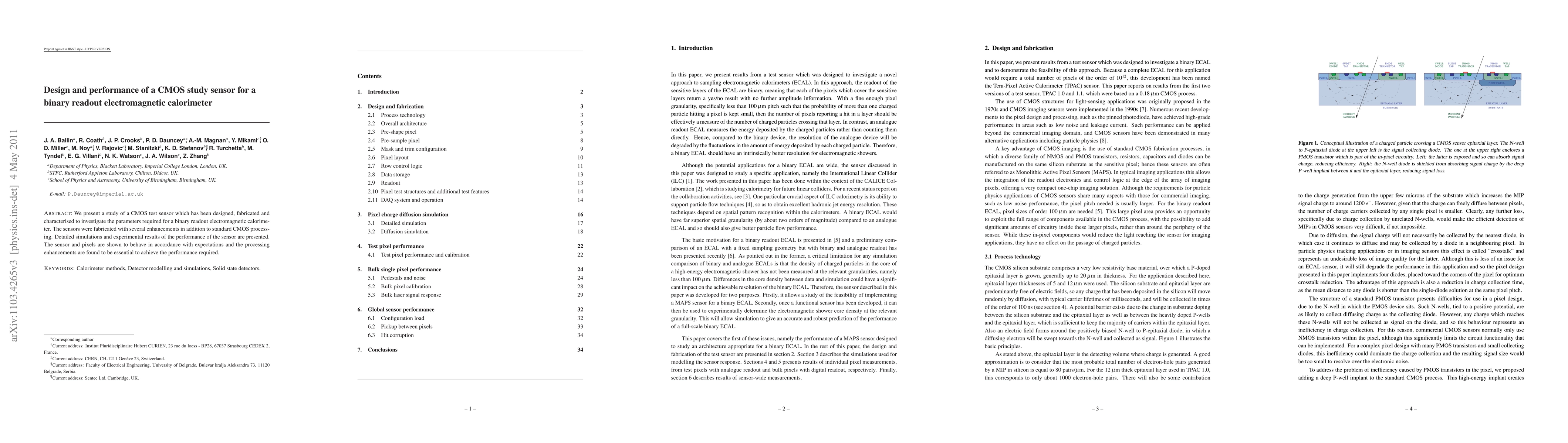 We present a study of a CMOS test sensor which has been designed, fabricated and characterised to investigate the parameters required for a binary readout electromagnetic calorimeter. The sensors were fabricated with several enhancements in addition to standard CMOS processing. Detailed simulations and experimental results of the performance of the sensor are presented. The sensor and pixels are shown to behave in accordance with expectations and the processing enhancements are found to be essential to achieve the performance required.
