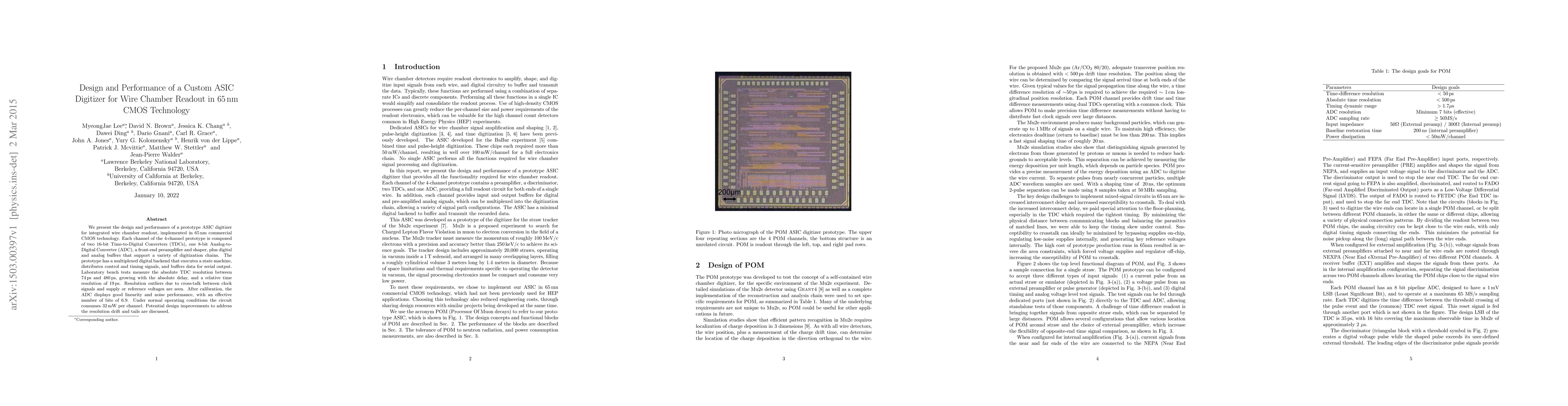 A custom ASIC digitizer for wire chamber readout in 65 nm CMOS technology has been designed and tested, achieving resolutions of 74 ps to 480 ps and consuming 32 mW per channel.