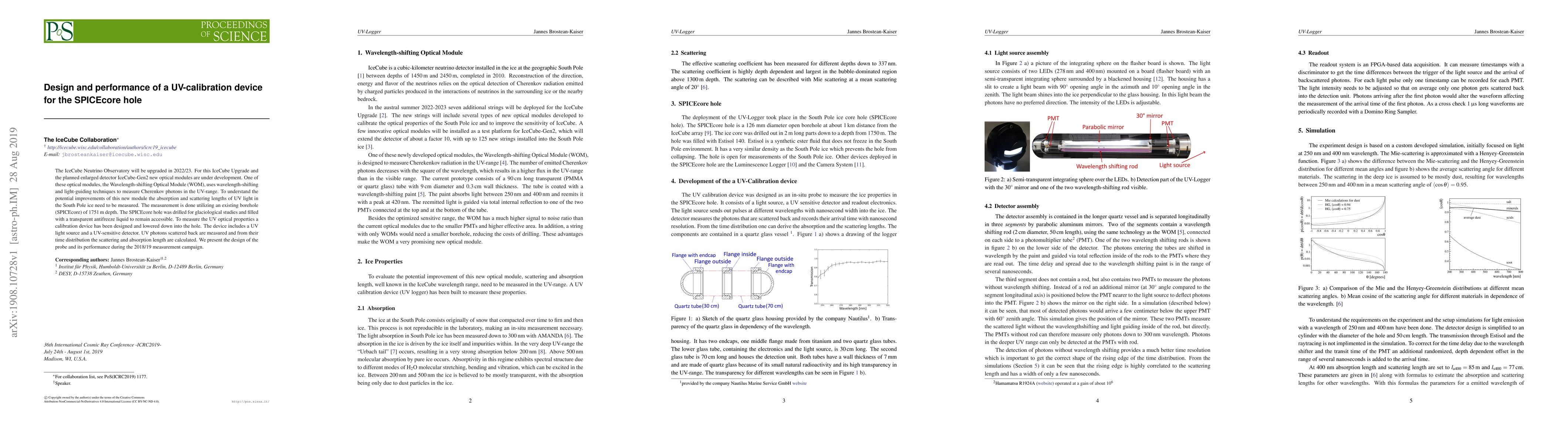 This paper describes the design and performance of a UV-calibration device deployed in the SPICEcore borehole to measure the absorption and scattering lengths of UV light in South Pole ice, crucial for the development of new optical modules in the IceCube Neutrino Observatory upgrade. The device successfully measured UV photons during the 2018/19 campaign, providing data for potential improvements in the Wavelength-shifting Optical Module (WOM).