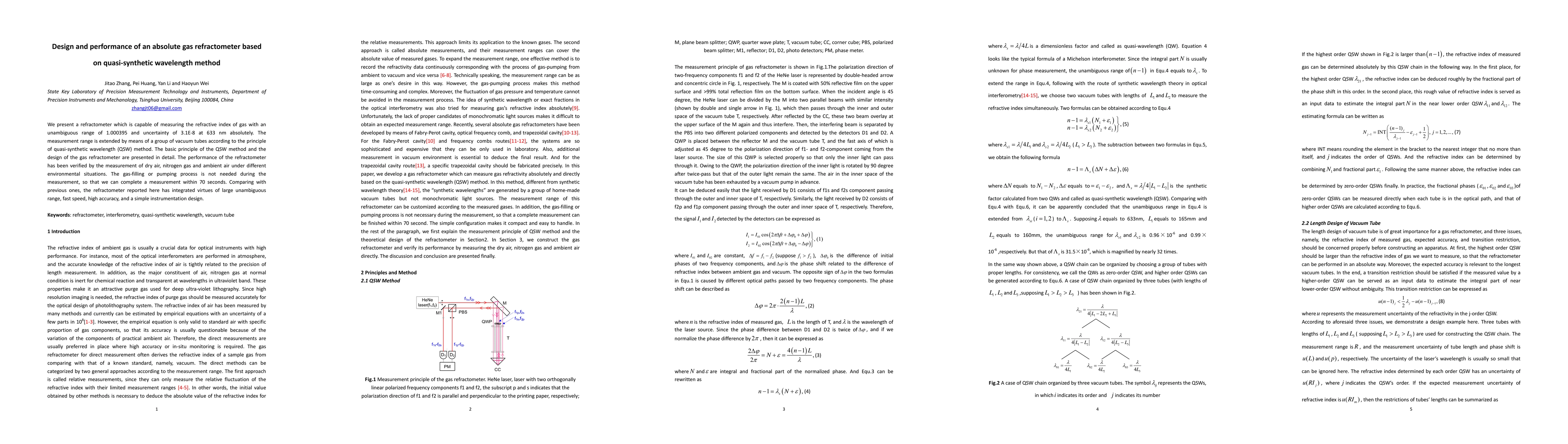 This paper introduces an absolute gas refractometer utilizing the quasi-synthetic wavelength method, achieving a refractive index measurement range of 1.000395 with an uncertainty of 3.1E-8 at 633 nm. The device operates without gas-filling or pumping, completing measurements in 70 seconds and demonstrating high accuracy and speed.