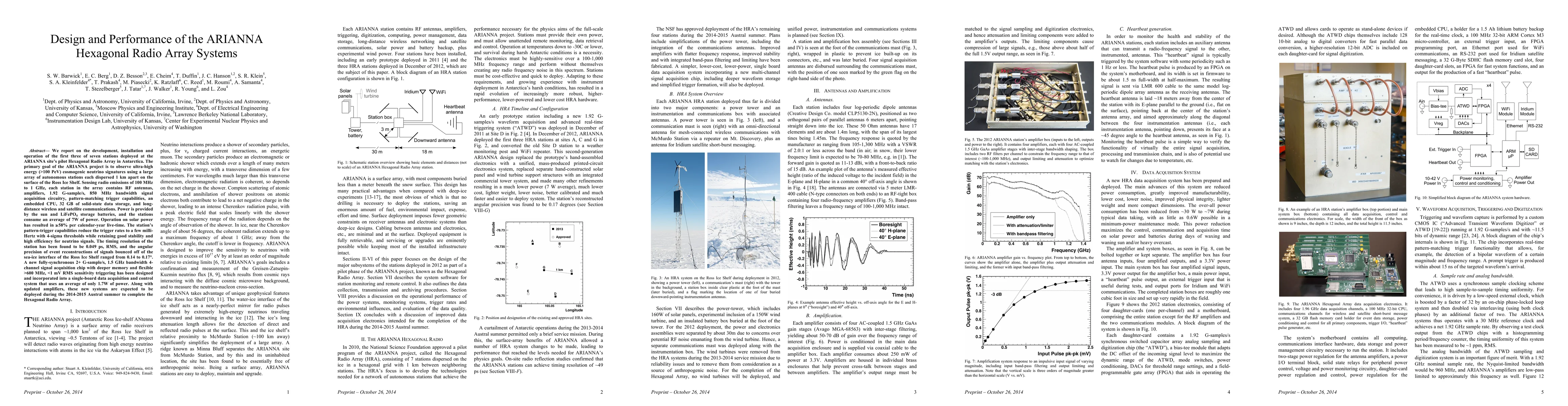 The ARIANNA Hexagonal Radio Array in Antarctica comprises autonomous stations observing ultra-high energy neutrinos by detecting radio emissions. The initial three stations, each consuming 7W on solar power, achieve >=58% live-time and feature advanced signal acquisition and processing capabilities for precise event reconstruction.