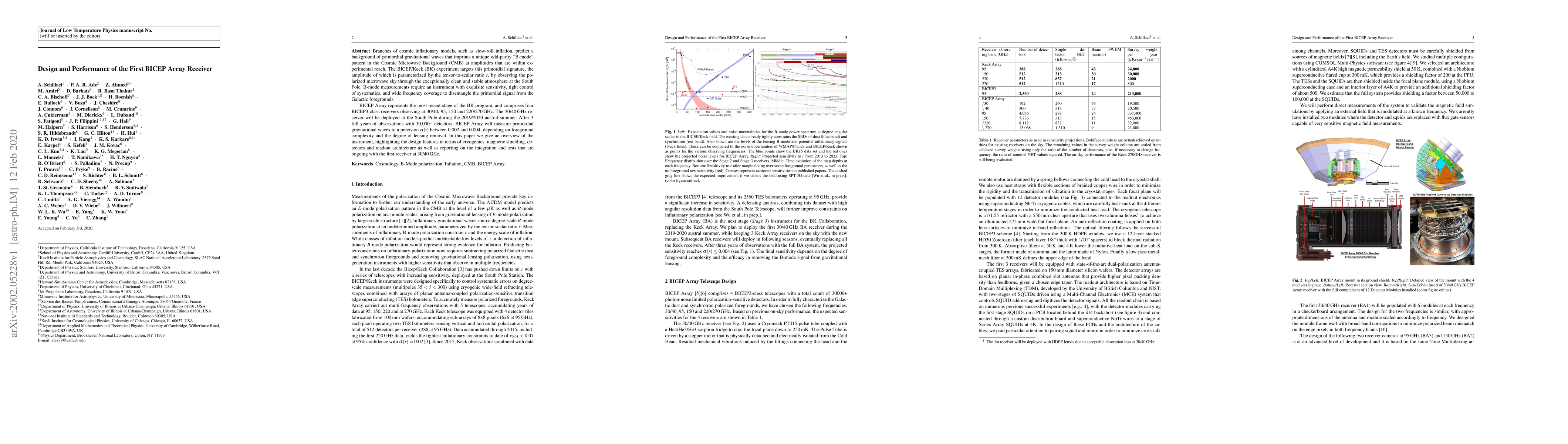 This paper provides an overview of the design and performance of the first BICEP Array receiver, focusing on the instrument's cryogenics, magnetic shielding, detectors, and readout architecture. The BICEP Array aims to detect primordial gravitational waves by observing B-mode polarization in the Cosmic Microwave Background, with the first receiver operating at 30/40 GHz.