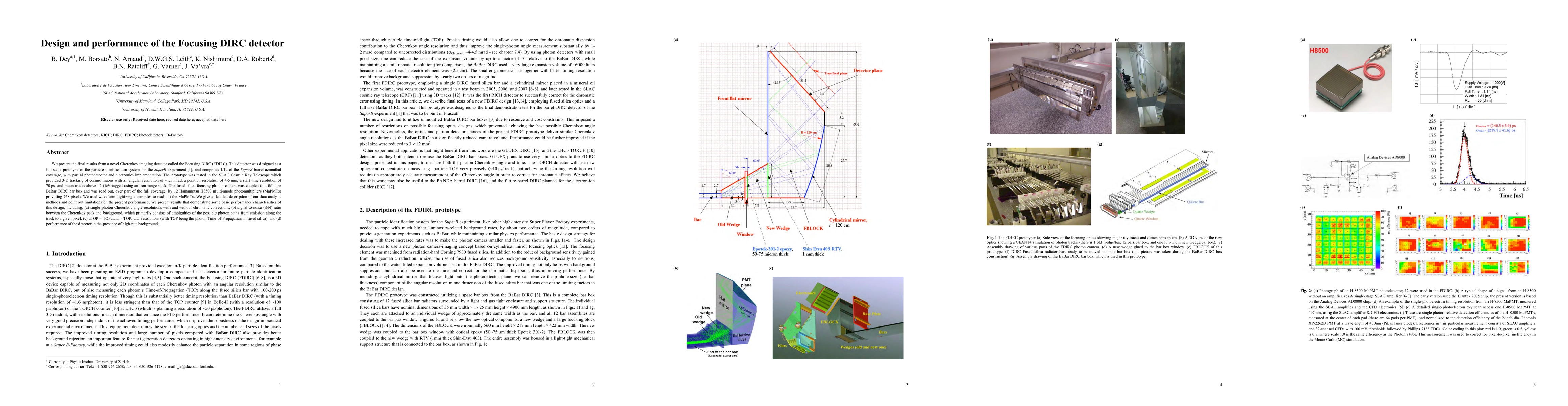 We present the final results from a novel Cherenkov imaging detector called the Focusing DIRC (FDIRC). This detector was designed as a full-scale prototype of the particle identification system for the SuperB experiment [1], and comprises 1/12 of the SuperB barrel azimuthal coverage, with partial photodetector and electronics implementation. The prototype was tested in the SLAC Cosmic Ray Telescope which provided 3-D tracking of cosmic muons with an angular resolution of ~1.5 mrad, a position resolution of 4-5 mm, a start time resolution of 70 ps, and muon tracks above ~2 GeV tagged using an iron range stack. The fused silica focusing photon camera was coupled to a full-size BaBar DIRC bar box and was read out, over part of the full coverage, by 12 Hamamatsu H8500 multi-anode photomultipliers (MaPMTs) providing 768 pixels. We used waveform digitizing electronics to read out the MaPMTs. We give a detailed description of our data analysis methods and point out limitations on the present performance. We present results that demonstrate some basic performance characteristics of this design, including: (a) single photon Cherenkov angle resolutions with and without chromatic corrections, (b) signal-to-noise (S/N) ratio between the Cherenkov peak and background, which primarily consists of ambiguities of the possible photon paths from emission along the track to a given pixel, (c) dTOP = TOP_measured - TOP_expected resolutions (with TOP being the photon Time-of-Propagation in fused silica), and (d) performance of the detector in the presence of high-rate backgrounds.