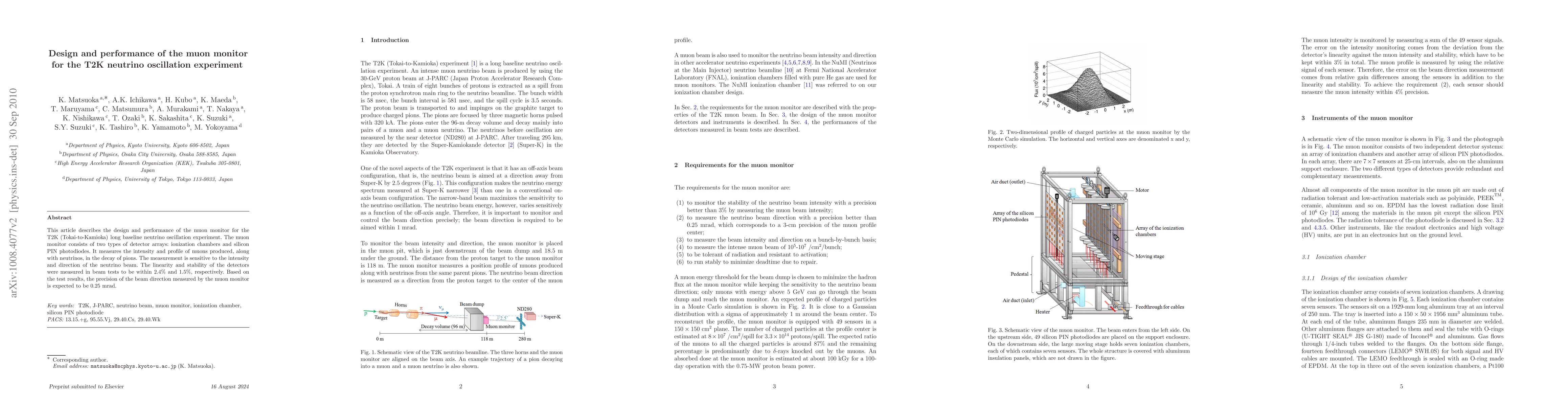The muon monitor for the T2K neutrino oscillation experiment comprises ionization chambers and silicon PIN photodiodes to measure muon intensity and profile, crucial for assessing neutrino beam characteristics. Beam tests indicate linearity within 2.4% and stability within 1.5%, projecting a beam direction precision of 0.25 mrad.