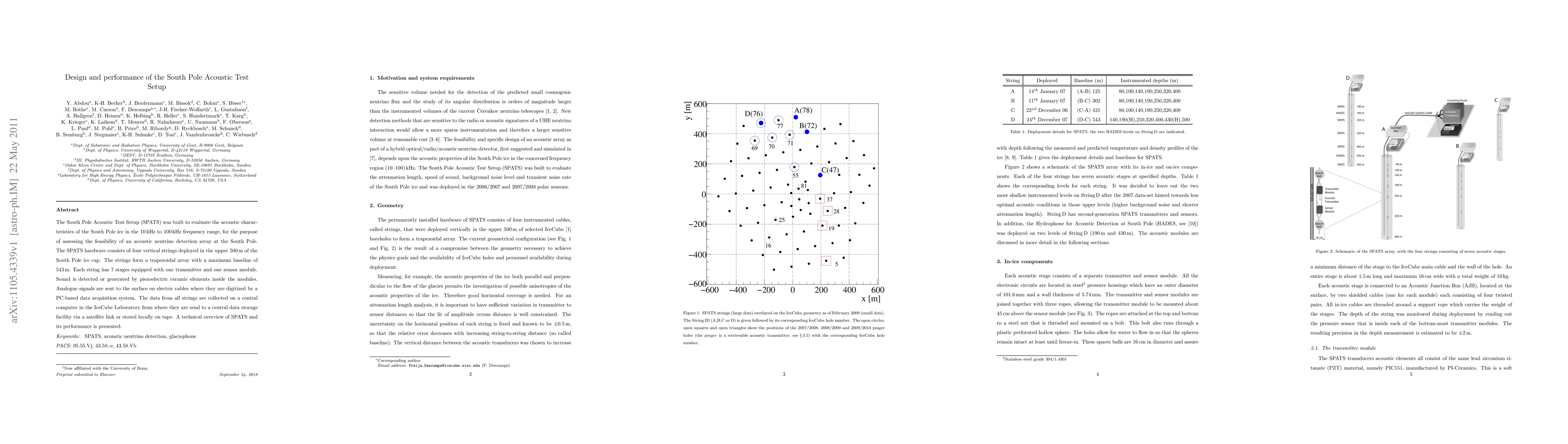The South Pole Acoustic Test Setup (SPATS) evaluates the acoustic properties of ice for potential neutrino detection, utilizing four vertical strings with sensors and transmitters in the 10 kHz to 100 kHz range. The system's performance and data collection are managed via a PC-based data acquisition system and satellite link.