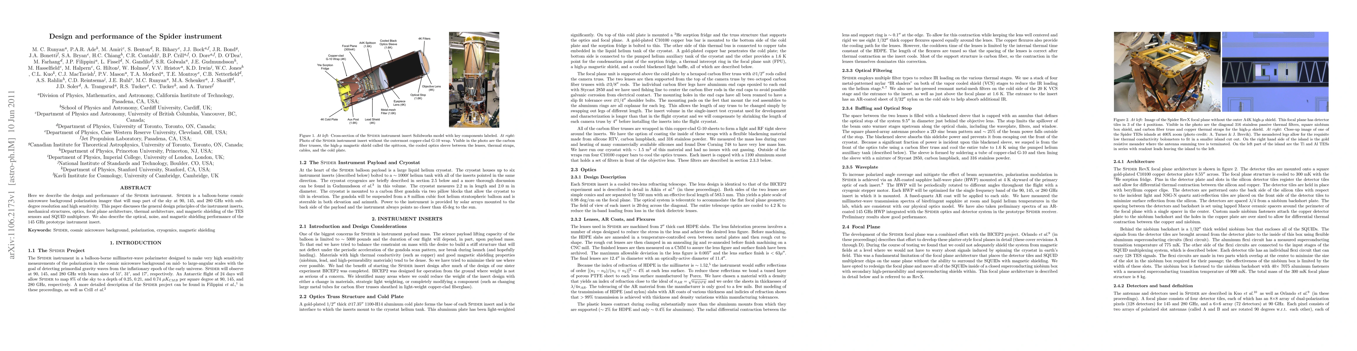 Here we describe the design and performance of the Spider instrument. Spider is a balloon-borne cosmic microwave background polarization imager that will map part of the sky at 90, 145, and 280 GHz with sub-degree resolution and high sensitivity. This paper discusses the general design principles of the instrument inserts, mechanical structures, optics, focal plane architecture, thermal architecture, and magnetic shielding of the TES sensors and SQUID multiplexer. We also describe the optical, noise, and magnetic shielding performance of the 145 GHz prototype instrument insert.
