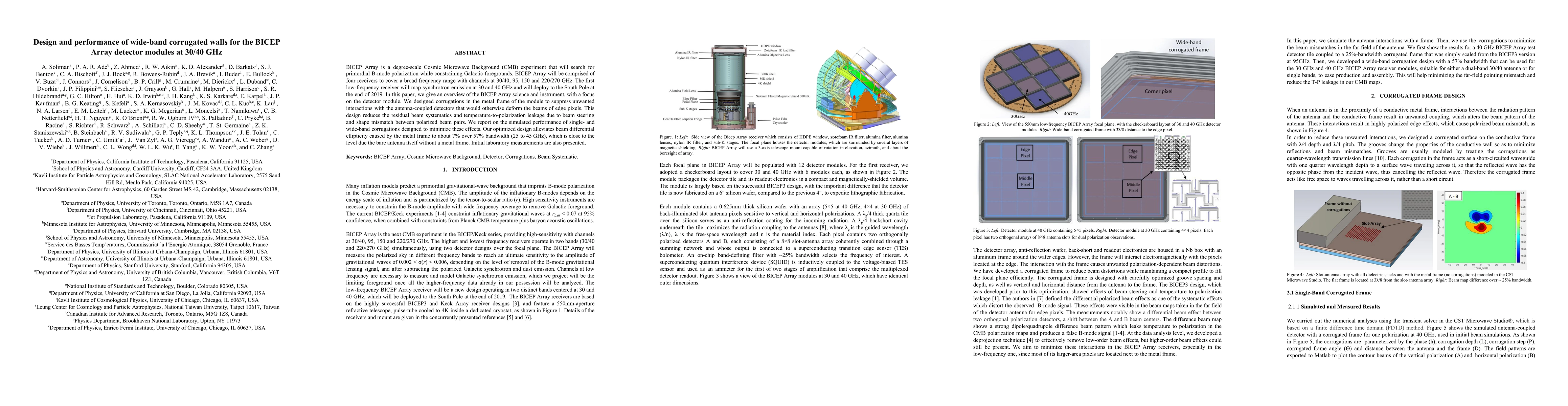 BICEP Array is a degree-scale Cosmic Microwave Background (CMB) experiment that will search for primordial B-mode polarization while constraining Galactic foregrounds. BICEP Array will be comprised of four receivers to cover a broad frequency range with channels at 30/40, 95, 150 and 220/270 GHz. The first low-frequency receiver will map synchrotron emission at 30 and 40 GHz and will deploy to the South Pole at the end of 2019. In this paper, we give an overview of the BICEP Array science and instrument, with a focus on the detector module. We designed corrugations in the metal frame of the module to suppress unwanted interactions with the antenna-coupled detectors that would otherwise deform the beams of edge pixels. This design reduces the residual beam systematics and temperature-to-polarization leakage due to beam steering and shape mismatch between polarized beam pairs. We report on the simulated performance of single- and wide-band corrugations designed to minimize these effects. Our optimized design alleviates beam differential ellipticity caused by the metal frame to about 7% over 57% bandwidth (25 to 45 GHz), which is close to the level due the bare antenna itself without a metal frame. Initial laboratory measurements are also presented.