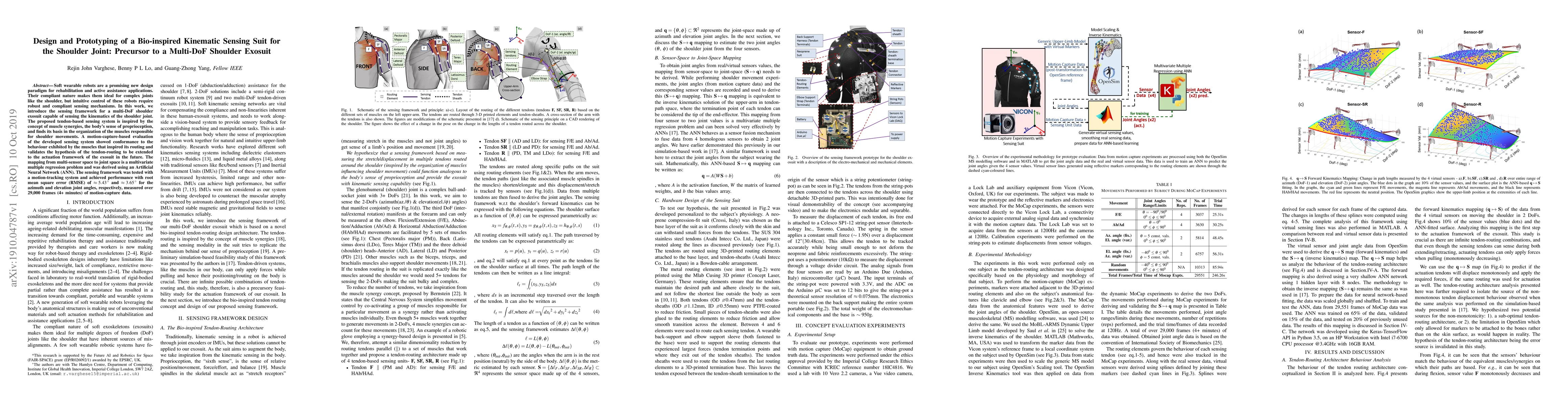 Soft wearable robots are a promising new design paradigm for rehabilitation and active assistance applications. Their compliant nature makes them ideal for complex joints like the shoulder, but intuitive control of these robots require robust and compliant sensing mechanisms. In this work, we introduce the sensing framework for a multi-DoF shoulder exosuit capable of sensing the kinematics of the shoulder joint. The proposed tendon-based sensing system is inspired by the concept of muscle synergies, the body's sense of proprioception, and finds its basis in the organization of the muscles responsible for shoulder movements. A motion-capture-based evaluation of the developed sensing system showed conformance to the behaviour exhibited by the muscles that inspired its routing and validates the hypothesis of the tendon-routing to be extended to the actuation framework of the exosuit in the future. The mapping from multi-sensor space to joint space is a multivariate multiple regression problem and was derived using an Artificial Neural Network (ANN). The sensing framework was tested with a motion-tracking system and achieved performance with root mean square error (RMSE) of approximately 5.43 degrees and 3.65 degrees for the azimuth and elevation joint angles, respectively, measured over 29000 frames (4+ minutes) of motion-capture data.