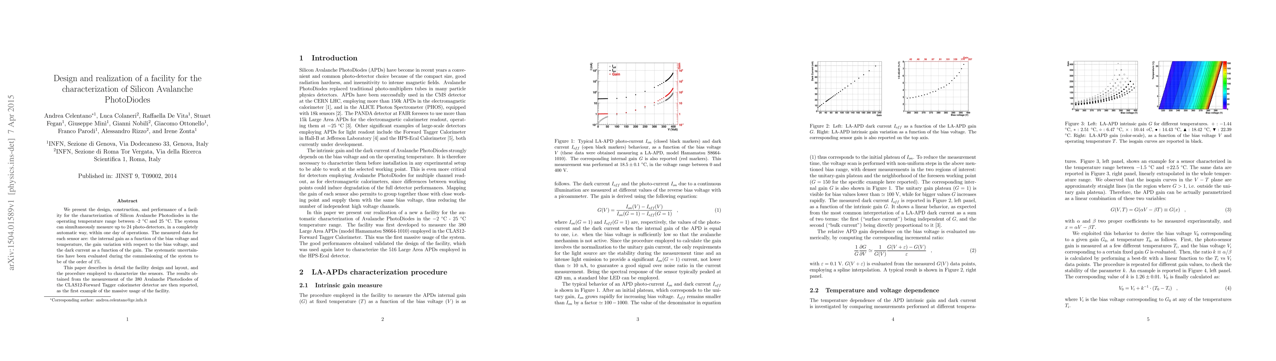 We present the design, construction, and performance of a facility for the characterization of Silicon Avalanche Photodiodes in the operating temperature range between -2 $^\circ$C and 25 $^\circ$C. The system can simultaneously measure up to 24 photo-detectors, in a completely automatic way, within one day of operations. The measured data for each sensor are: the internal gain as a function of the bias voltage and temperature, the gain variation with respect to the bias voltage, and the dark current as a function of the gain. The systematic uncertainties have been evaluated during the commissioning of the system to be of the order of 1%. This paper describes in detail the facility design and layout, and the procedure employed to characterize the sensors. The results obtained from the measurement of the 380 Avalanche Photodiodes of the CLAS12-Forward Tagger calorimeter detector are then reported, as the first example of the massive usage of the facility.