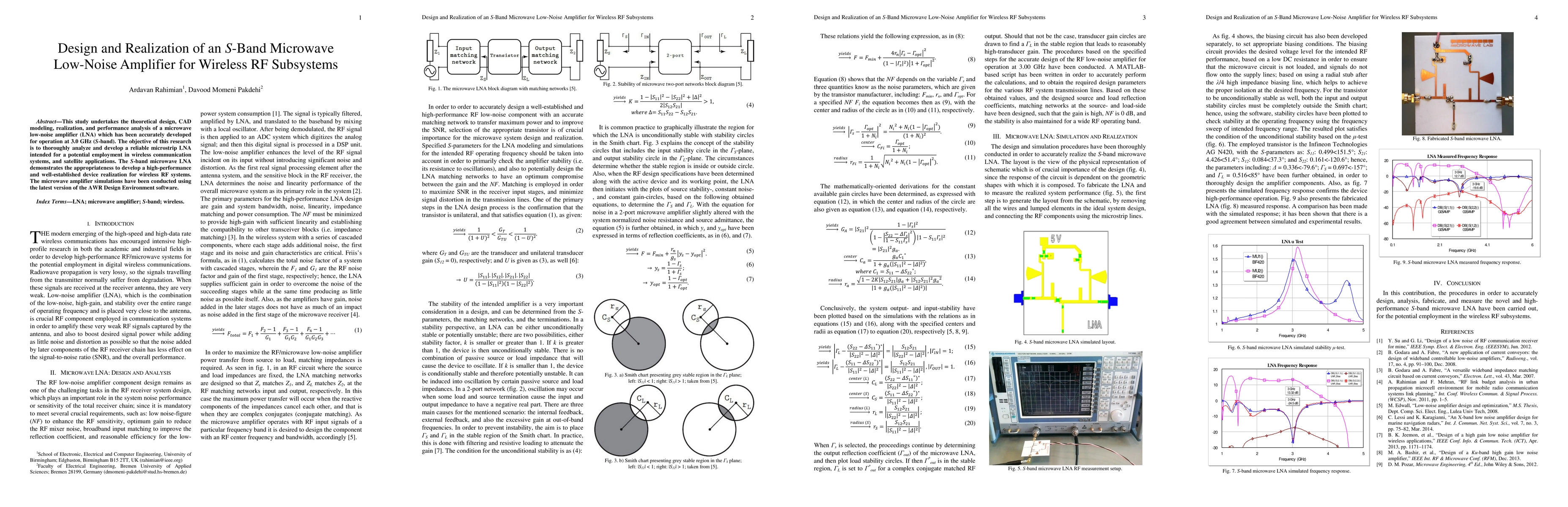 This study designs and realizes a 3.0 GHz S-band microwave low-noise amplifier (LNA) using CAD modeling and microstrip technology, aiming for use in wireless communication and satellite applications. Simulation results using AWR Design Environment software confirm the LNA's high performance.
