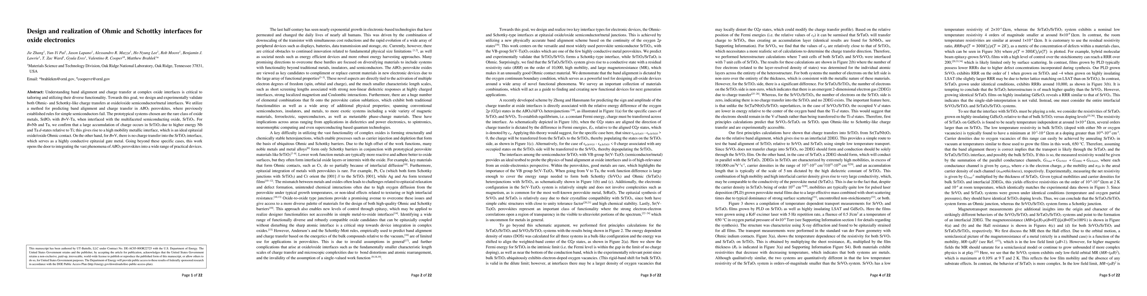 This paper designs and validates Ohmic and Schottky interfaces in oxide/oxide semiconductor/metal systems, focusing on SrBO3 (B=V-Ta) interfaces with SrTiO3. It demonstrates the formation of high mobility metallic interfaces for B=Nb and Ta, while B=V forms a conductive gate metal, highlighting the potential for diverse applications in oxide electronics.