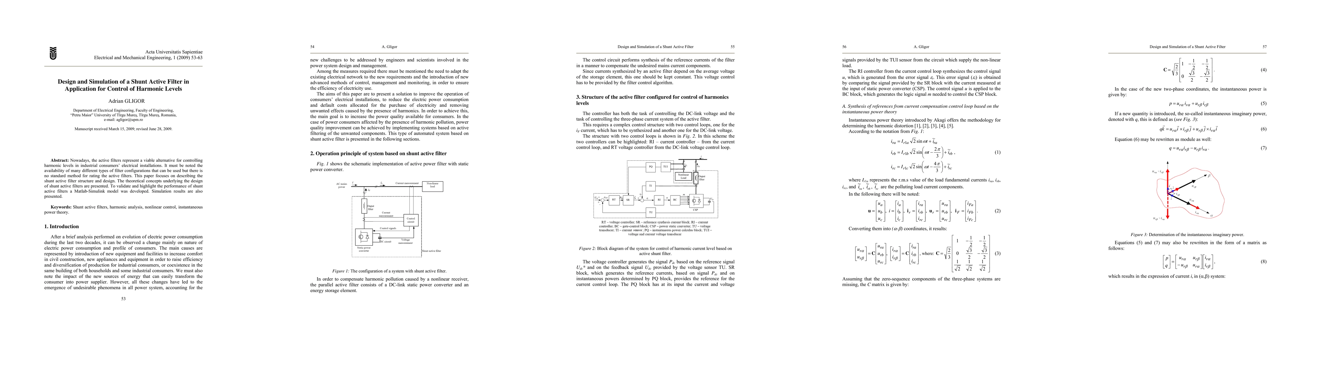Nowadays, the active filters represent a viable alternative for controlling harmonic levels in industrial consumers electrical installations. It must be noted the availability of many different types of filter configurations that can be used but there is no standard method for rating the active filters. This paper focuses on describing the shunt active filter structure and design. The theoretical concepts underlying the design of shunt active filters are presented. To validate and highlight the performance of shunt active filters a Matlab-Simulink model was developed. Simulation results are also presented.