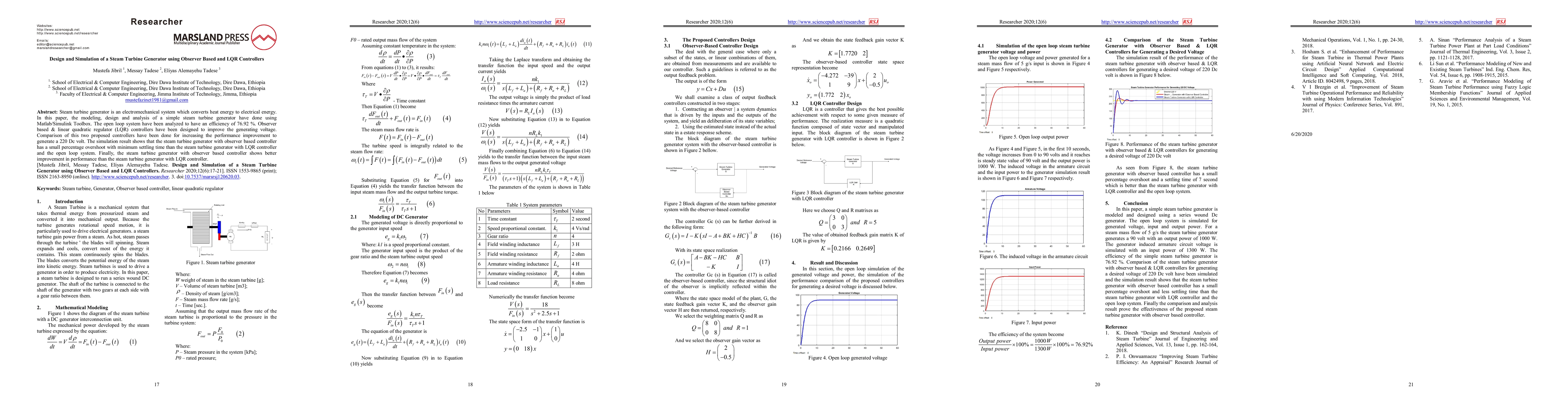 This paper models and simulates a steam turbine generator using Matlab/Simulink, analyzing its efficiency and employing observer-based and LQR controllers to enhance generating voltage. The observer-based controller demonstrates superior performance with lower overshoot and faster settling time compared to the LQR controller and the open loop system.
