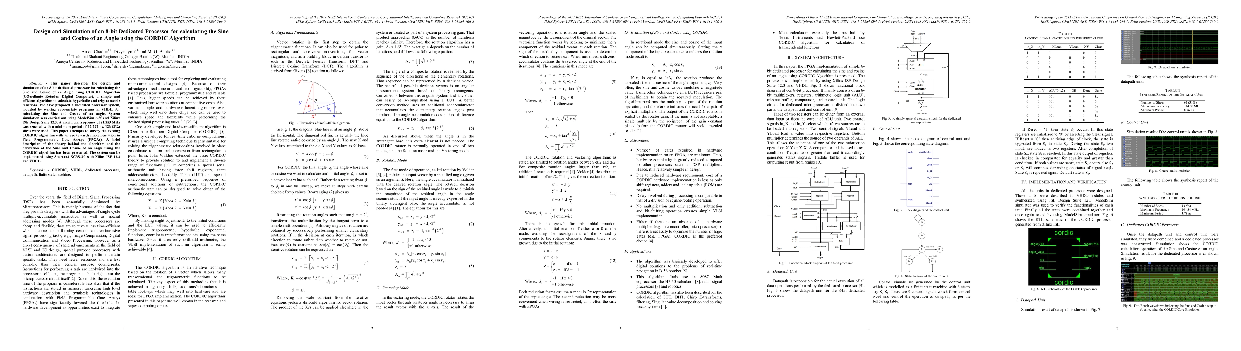 This paper details the design and simulation of an 8-bit dedicated processor for calculating Sine and Cosine using the CORDIC algorithm, achieving a maximum frequency of 81.353 MHz and implementing it in an FPGA using VHDL and Xilinx tools. The study also reviews the CORDIC algorithm's theoretical foundation and its practical FPGA implementation.