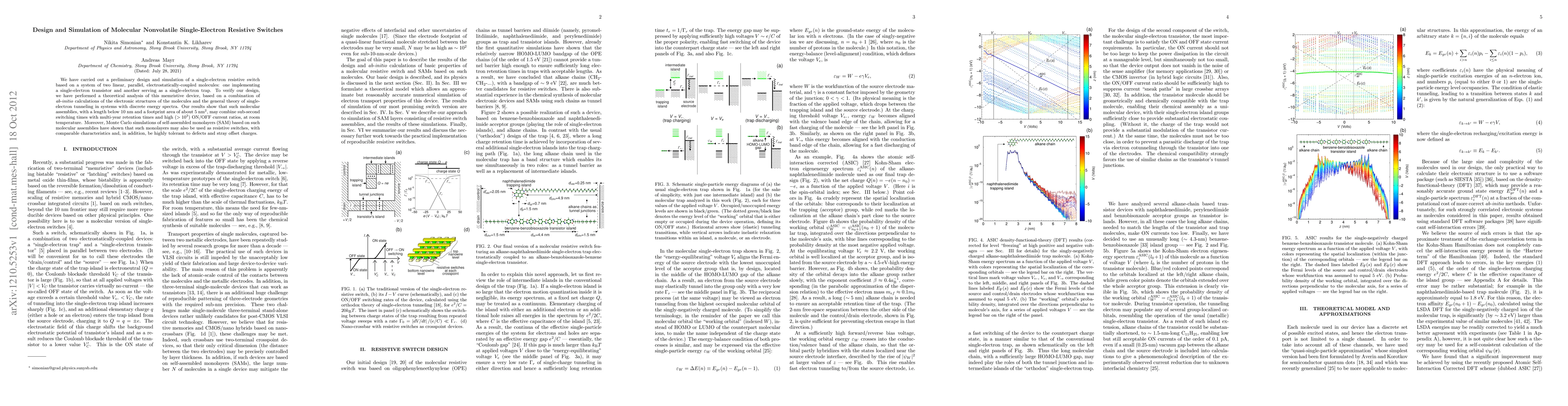 This paper presents a design and simulation of molecular nonvolatile single-electron resistive switches using electrostatically-coupled molecules. Theoretical analysis and Monte Carlo simulations indicate these switches can achieve sub-second switching times, multi-year retention, and high ON/OFF current ratios, with tolerance to defects.