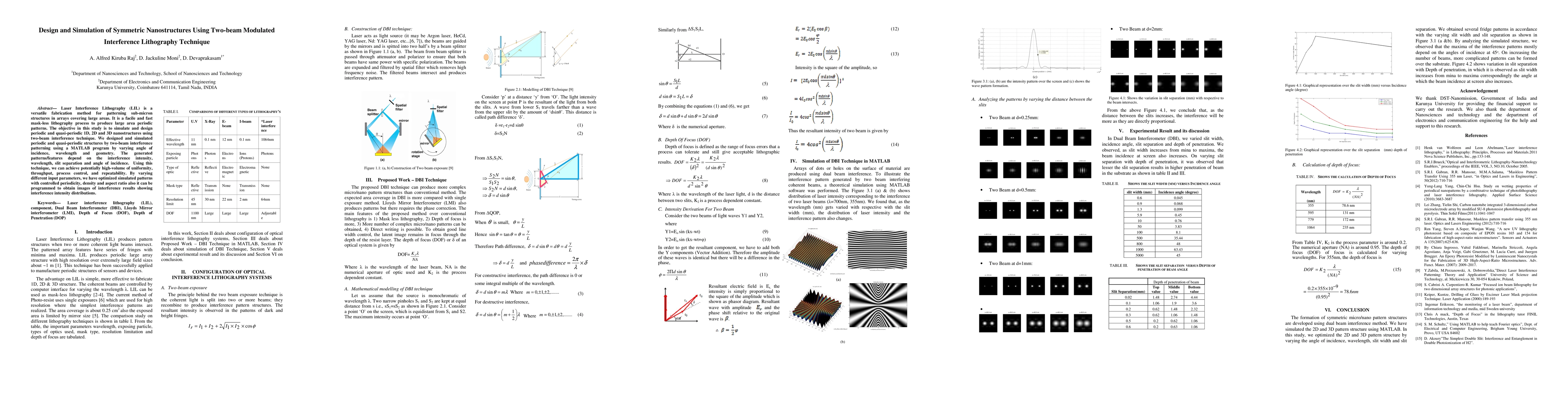 This paper explores the design and simulation of symmetric nanostructures using two-beam modulated interference lithography, employing a MATLAB program to optimize periodic and quasi-periodic 1D, 2D, and 3D patterns by varying the angle of incidence, wavelength, and geometry. The technique promises high uniformity, throughput, and repeatability.